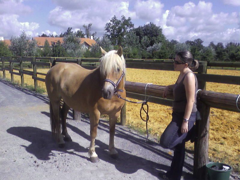 | Dire merci | celle-ci parce qu'après 2 ans de bagarres, 2 ans d'énervements, 2 ans de tentatives avortées, Vicky m'avait enfin rejoint à Lyon, et je pouvais donc enfin le voir tous les jours!!! pour lui aussi c'était le gros changement, il venait de passer d'une vie de cheval de club au box à une vie de cheval de proprio, au pré, avec des potes! et pour la première fois, je l'ai trouvé vraiment BEAU en photo |