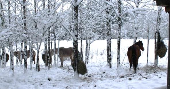 | Dire merci | J'ai noté le départ de Nati au 24/04/2011, c'est le jour où poussin est arrivé ici, il me semble que l'échange avait été organisé comme ça, de mémoire. Comme il était exceptionnel qu'on ait de l'herbe en abondance à cette date, je les avais déjà remis dans le grand champ, sous le cimetière, depuis 2 semaines. Il neige, il fait froid, mais Nati semble bien mieux supporter le froid cette année, ni les autres d'ailleurs, pas de tremblements révélateur et des chevaux bien cool au pré malgré le temps |