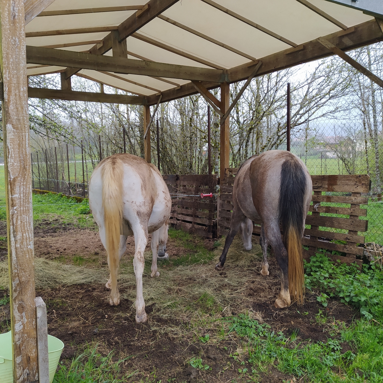 | Dire merci | dakapo74 oui la petite a son test negatif donc retour elle à l'école et moi au boulot lundi ![]() hier pluie pluie et pluie avec 7° je vais voir les juments et autant Quiara elle gérait autant Naska tremblotait sévère allez ni une ni deux, je les emmène à la maison et hop nuit au box ce matin je prépare les paddocks pour pouvoir surveiller tout le monde, je vais pour emmener les juments dans le paddock prévu et ah génial la voisine a coupé un arbre qui est tombé sur la cloture changement de programme donc et je les met dans la moitié du paddock d'hiver ![]() puis il se met à pleuvoir ![]() ![]() puis vient la grêle ![]() |