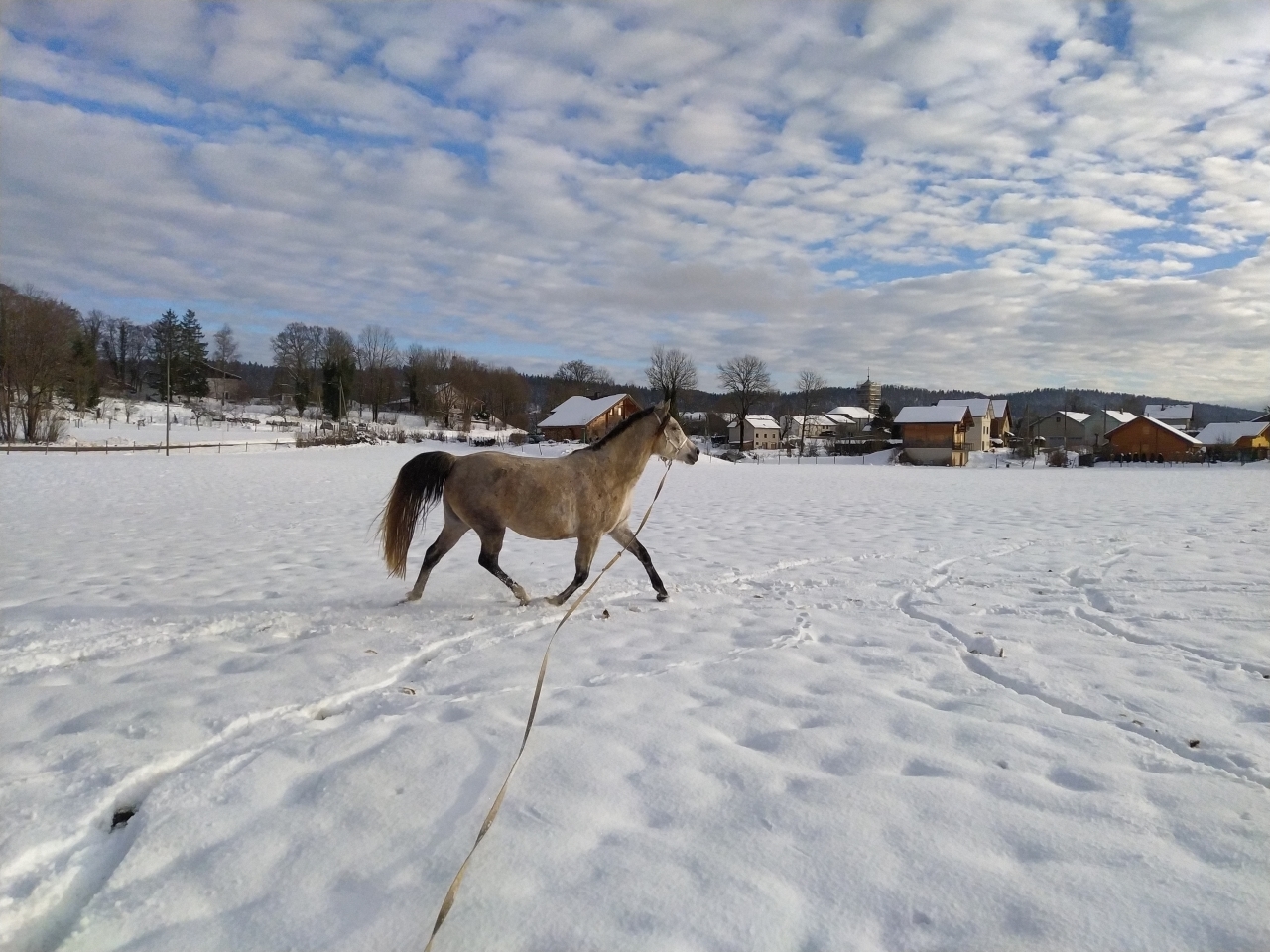| Dire merci | Ukaï fait pareil, mais jamais monté, mais en longe au deux mains. J'ai vu avec mon prof qui me dit que ce n'est rien, juste qu'il est souple et que ça l'amuse, donc je repasse au trot dans le calme et je lui redemande gentiment quand il se désunit. Et il a été vérifié de partout, tout roule. Il le fait vraiment autant à droite qu'à gauche et est capable de rester des tours et des tours comme ça, et de temps en temps il change tout seul aussi. |
