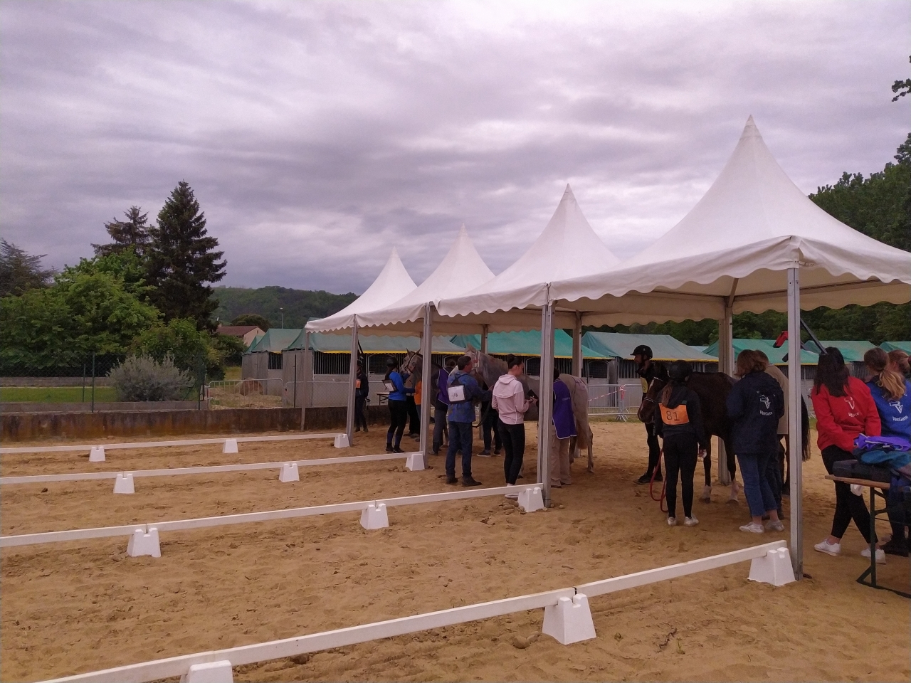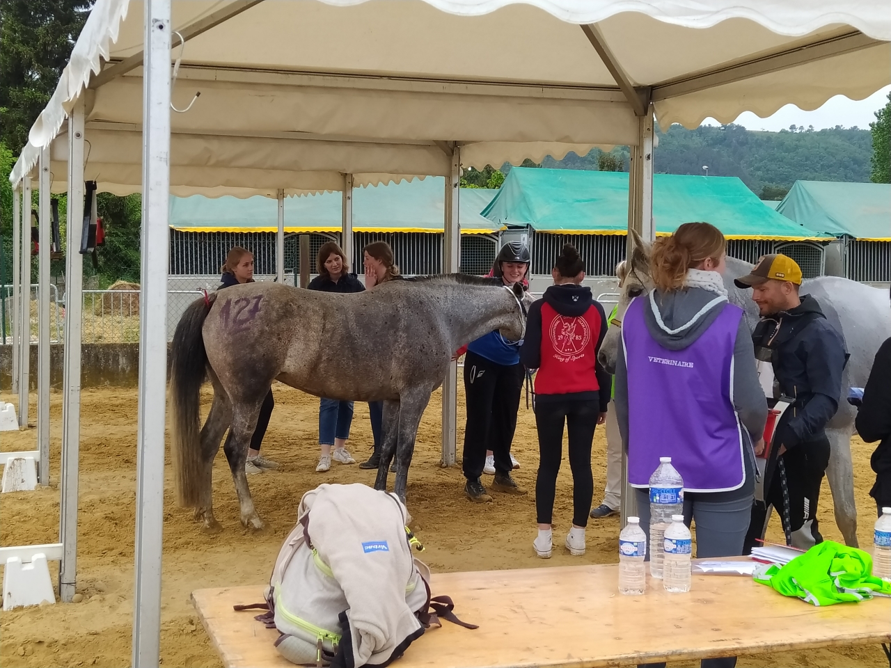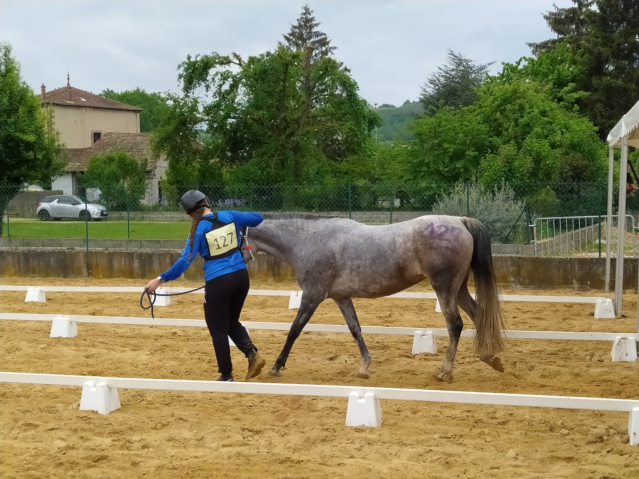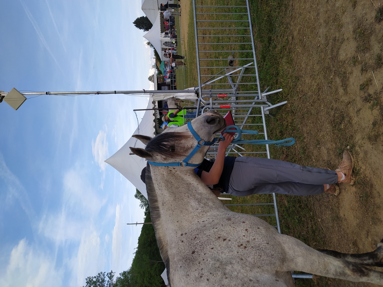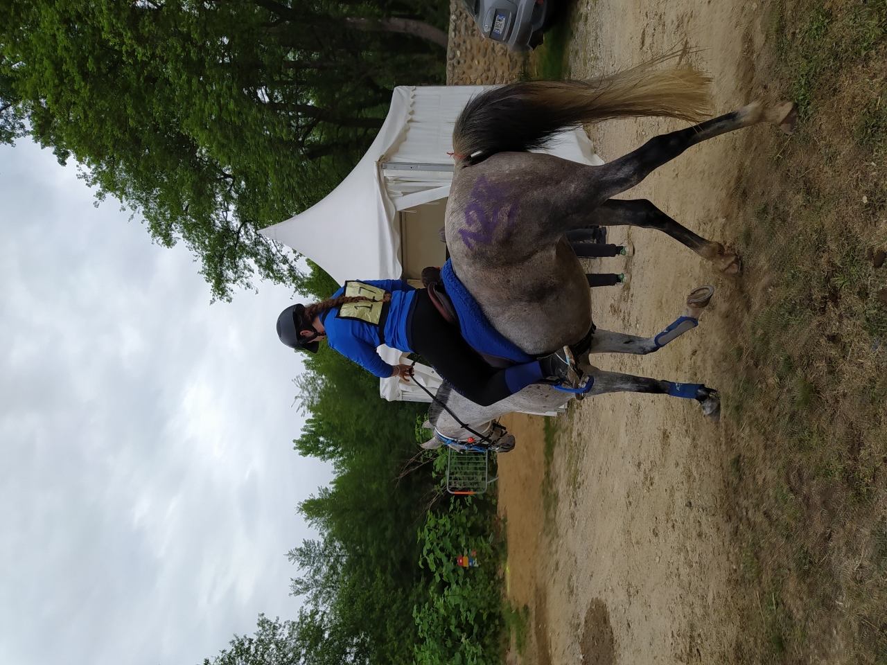 | Dire merci | Vendredi, M fera une petite détente au pas d'1h25, la jument est en forme me dit elle ![]() et arrive le départ, Samedi 14h, tout est chargé, le matos, la jument, M et sa maman G. On arrive sur place vers 17h, la jument a très bien voyagé malgré les 27° qui me sèchent lol On la décharge, on la marche, on va chercher les dossards, on lui fait un paddock, on commence à installer notre espace pour le lendemain matin et on la passe au controle. Malgré l'ambiance, elle reste calme, seul le haut parleur semblera l'agiter un peu... ![]() ![]() tout est ok, on la met au box puis on file dare dare chez Kagnotte pour papoter en 2-2 avant de retourner manger sur le site (repas prévu à 20h et il est déjà 19h !) |