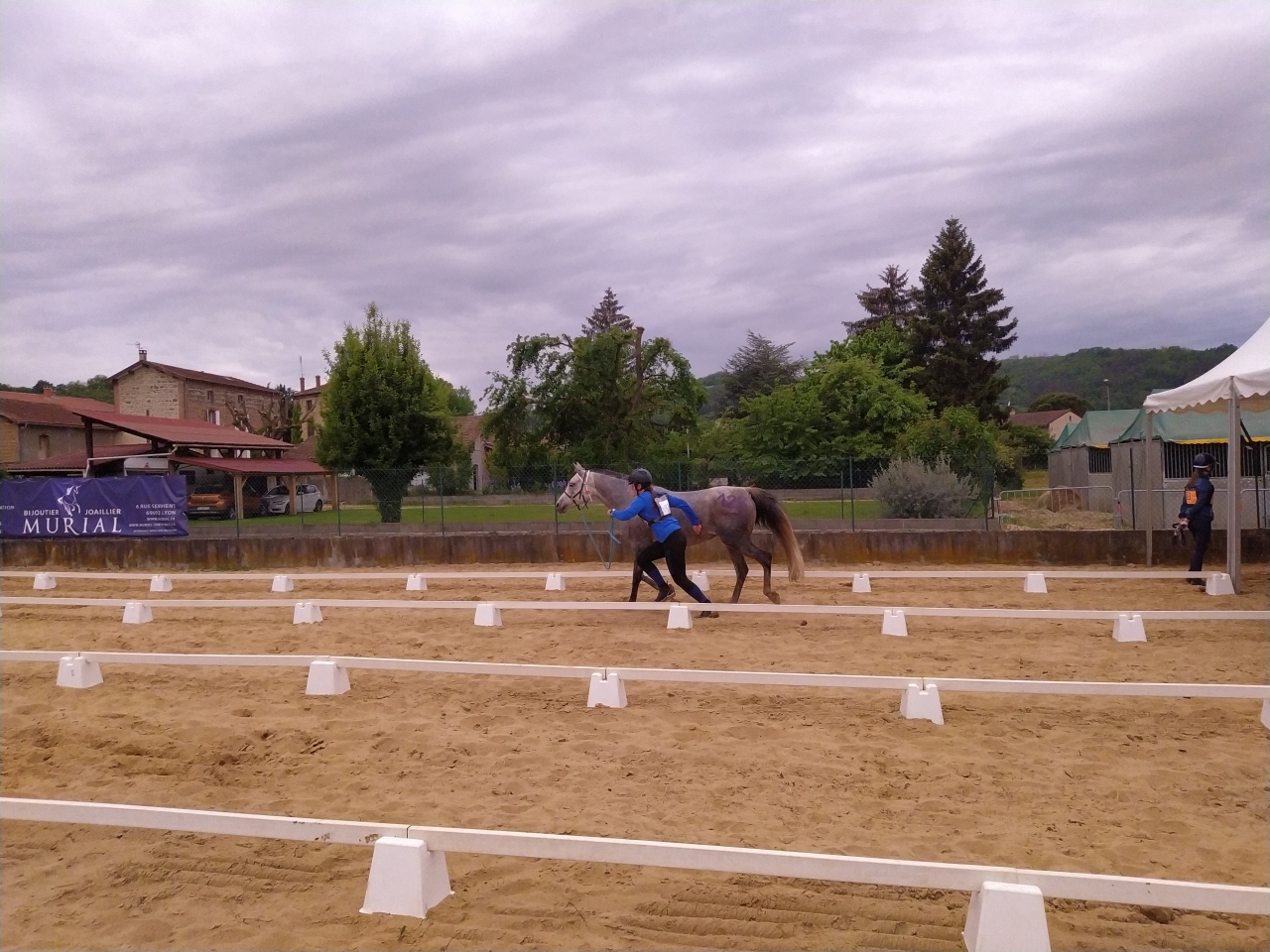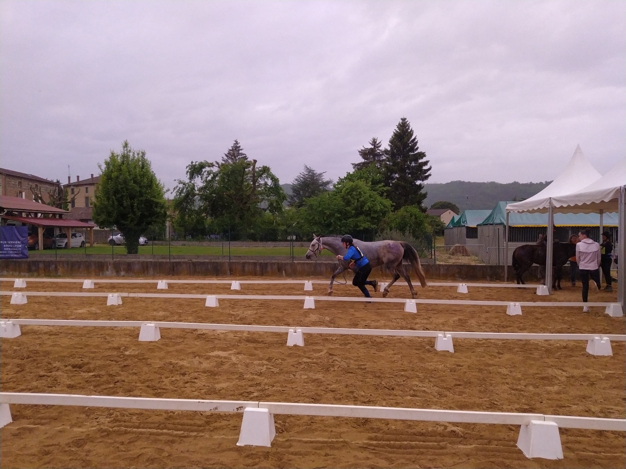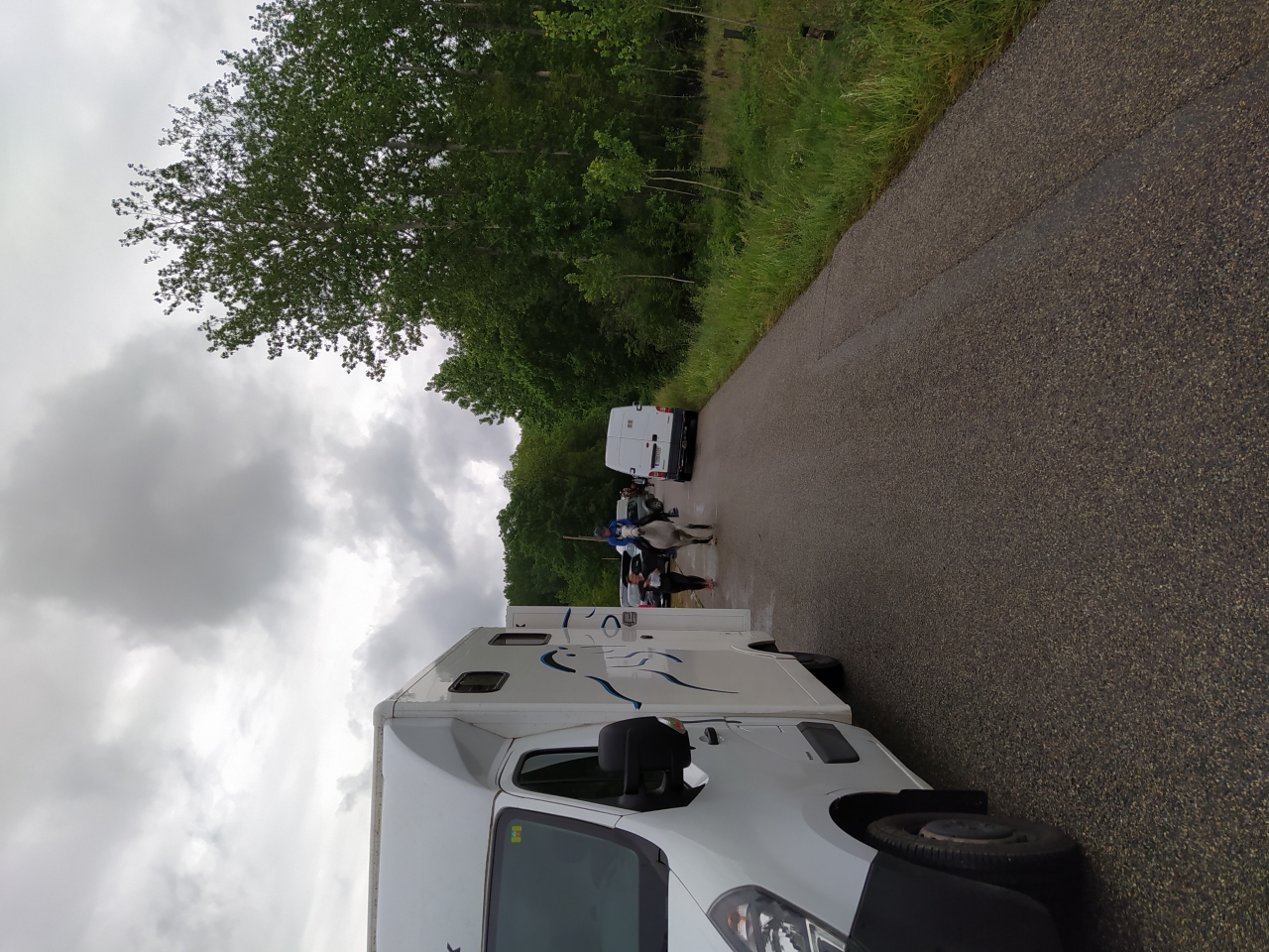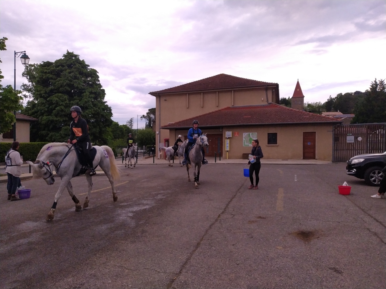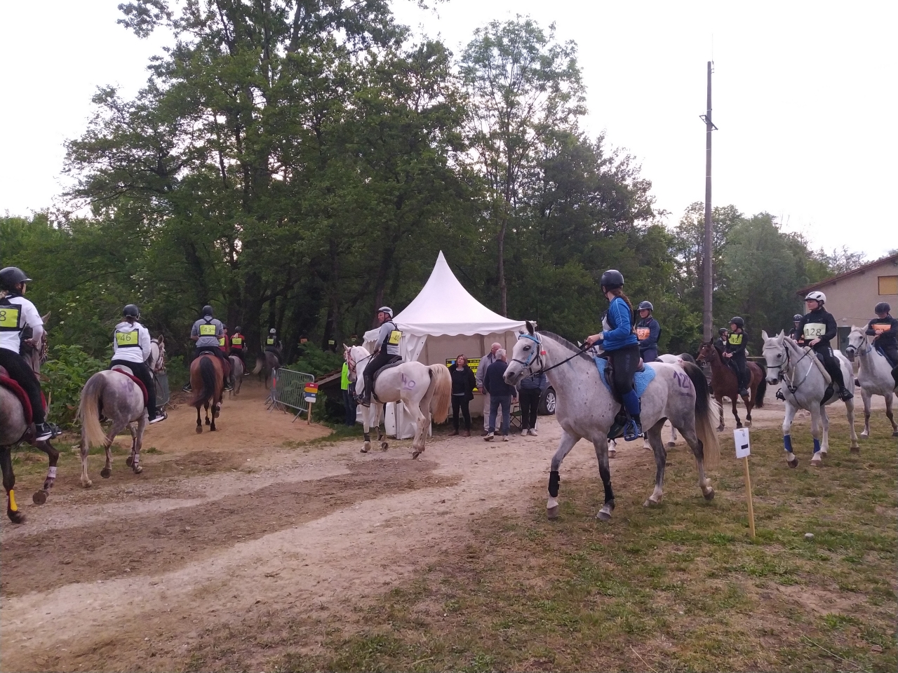 | Dire merci | Vendredi, M fera une petite détente au pas d'1h25, la jument est en forme me dit elle ![]() et arrive le départ, Samedi 14h, tout est chargé, le matos, la jument, M et sa maman G. On arrive sur place vers 17h, la jument a très bien voyagé malgré les 27° qui me sèchent lol On la décharge, on la marche, on va chercher les dossards, on lui fait un paddock, on commence à installer notre espace pour le lendemain matin et on la passe au controle. Malgré l'ambiance, elle reste calme, seul le haut parleur semblera l'agiter un peu... ![]() ![]() tout est ok, on la met au box puis on file dare dare chez Kagnotte pour papoter en 2-2 avant de retourner manger sur le site (repas prévu à 20h et il est déjà 19h !) |