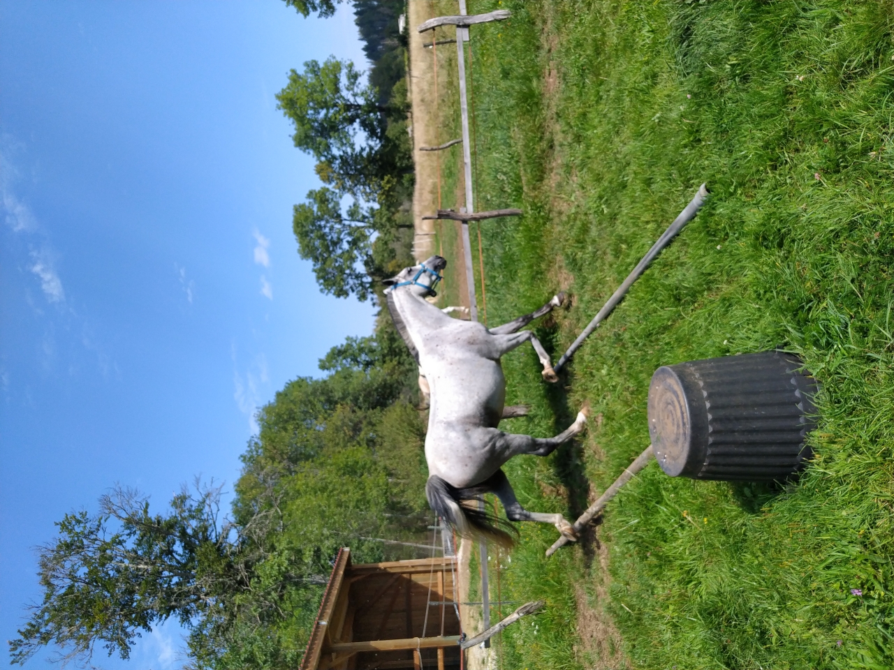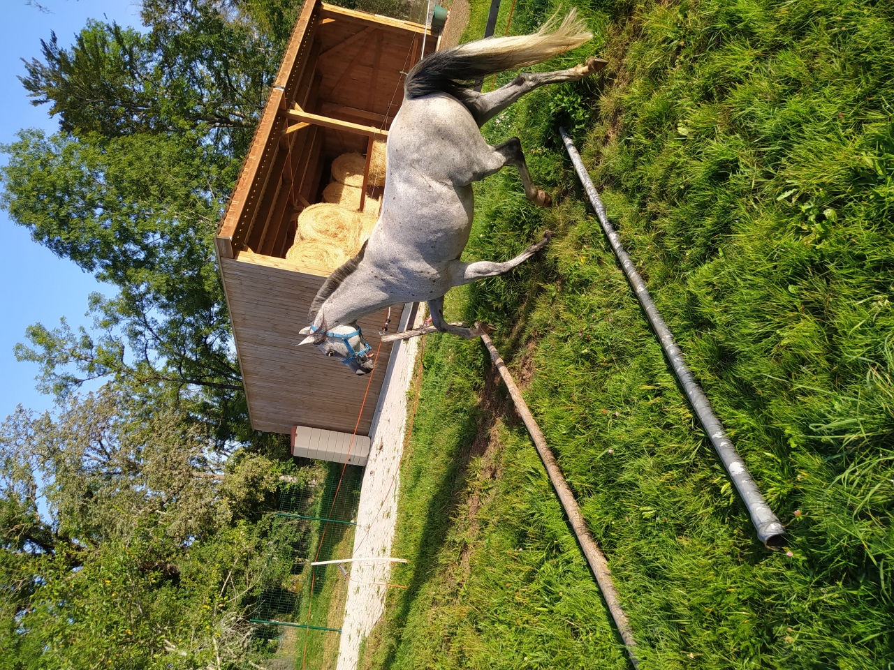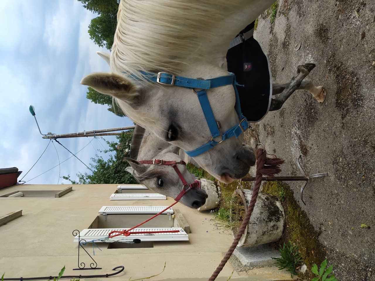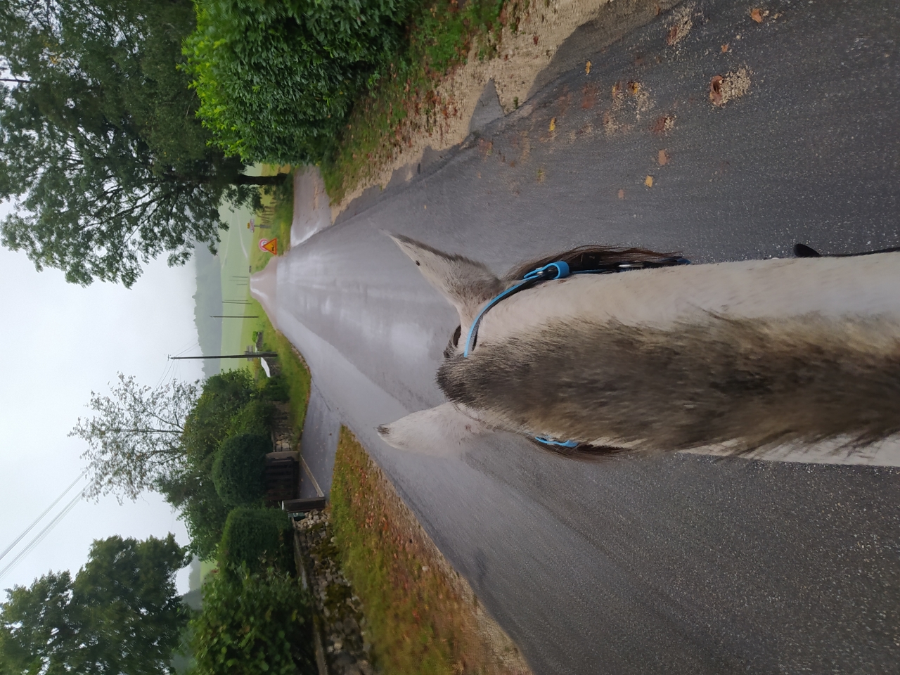 | Dire merci | Je vais donc chercher mon licol et l attache pour faire l inventaire de la carrosserie qui est bien rayée de partout. Désinfection des plaies et aluspray pour les mouches. ![]() Je regarde le parc, le fil n a pas bougé, elle a du sauter mais pourquoi? Allez on part en sortie, ce sera l occasion de voir si ça boîte... ![]() ![]() ![]() 6km plus tard nous voila de retour à la maison Je remets Naska au parc, à peine le temps de sortir, que Vanda la tabasse sur l arrière main avec les postérieurs 😱 |