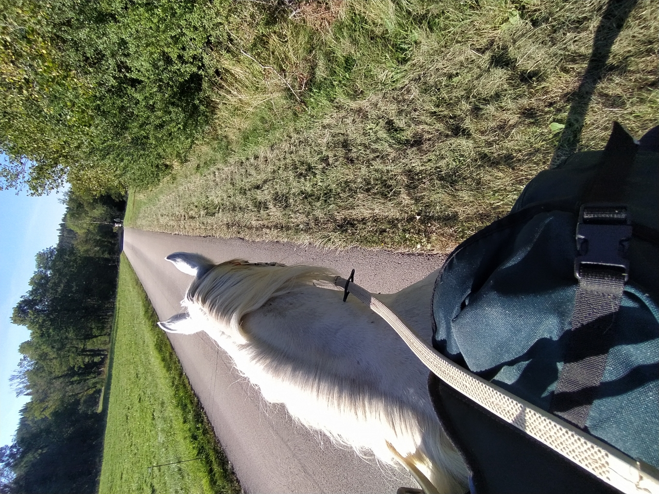 | Dire merci | Hier matin, je mets numerobis en écharpe, motivée pour marcher Naska en main. Je sors de chez moi et là je bug, Naska est du mauvais côté de la porte du pré donc à moitié sur la route 🙈 |