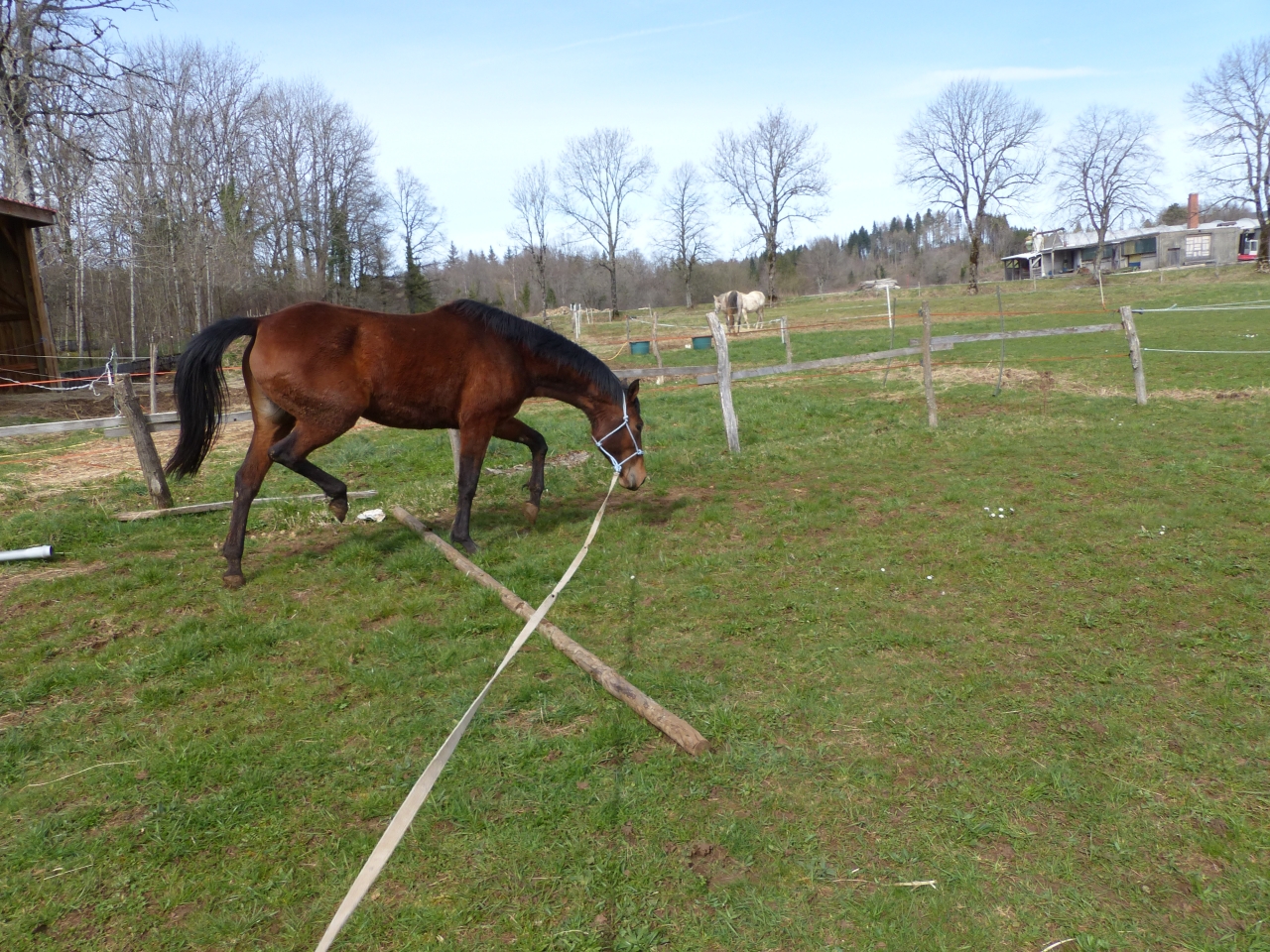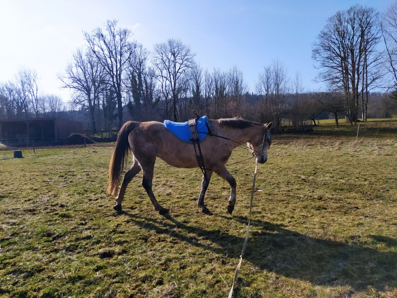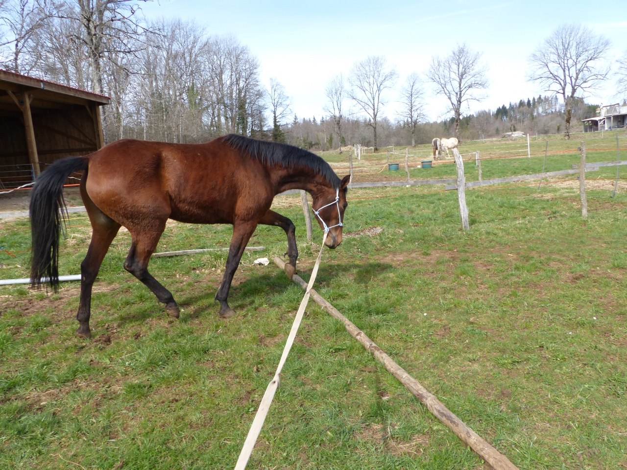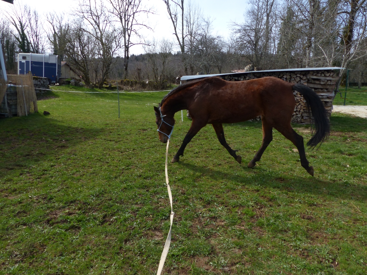 | Dire merci | Lundi Bon ben allez, c'est parti pour une (re)mise au boulot la miss a été débourrée gentiment l'an dernier puis remise au pré et en gros pas trop retouchée depuis octobre-novembre ![]() je décide d'une longe devant mes anciens boxs, c'est réduit ca permettra de canaliser ca se passe pas trop mal ![]() la barre au sol l'interpelle un peu ![]() elle a un joli mouvement ![]() ![]() mais... |
