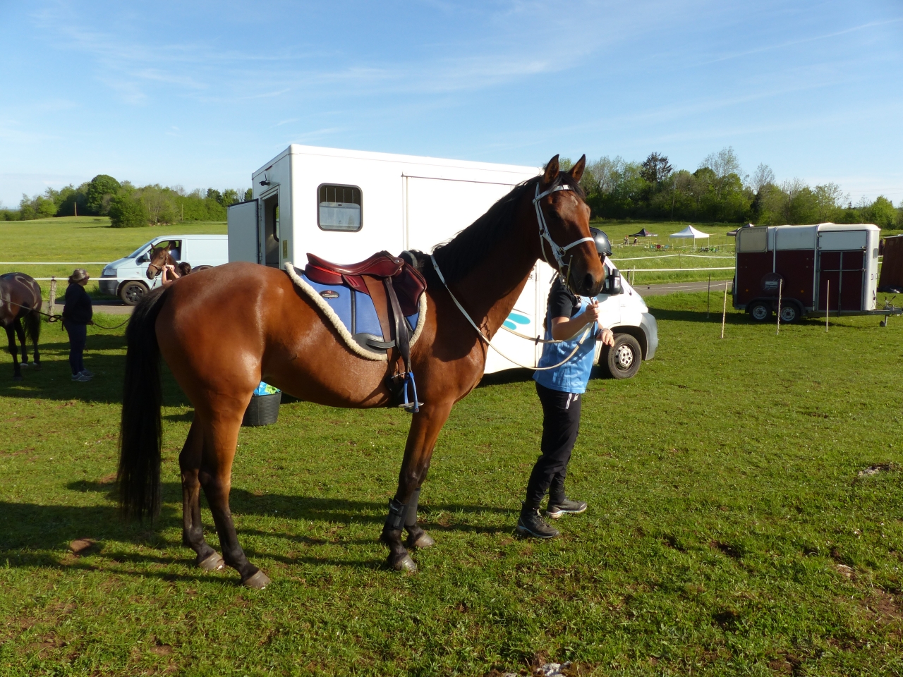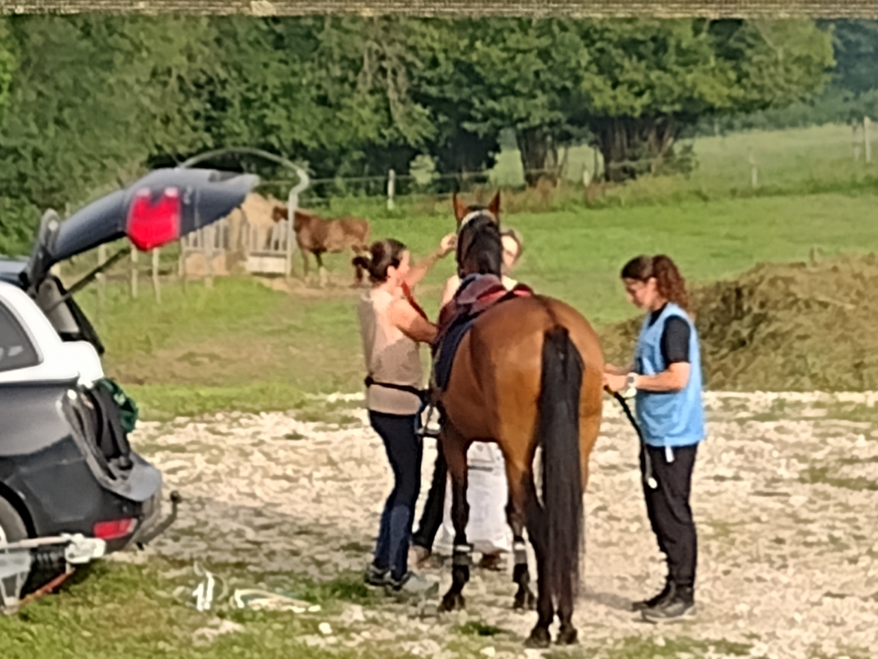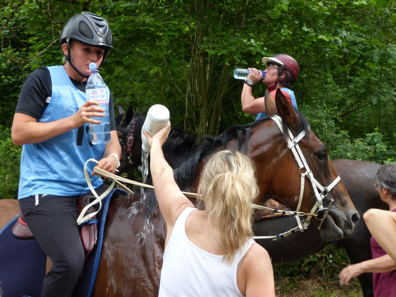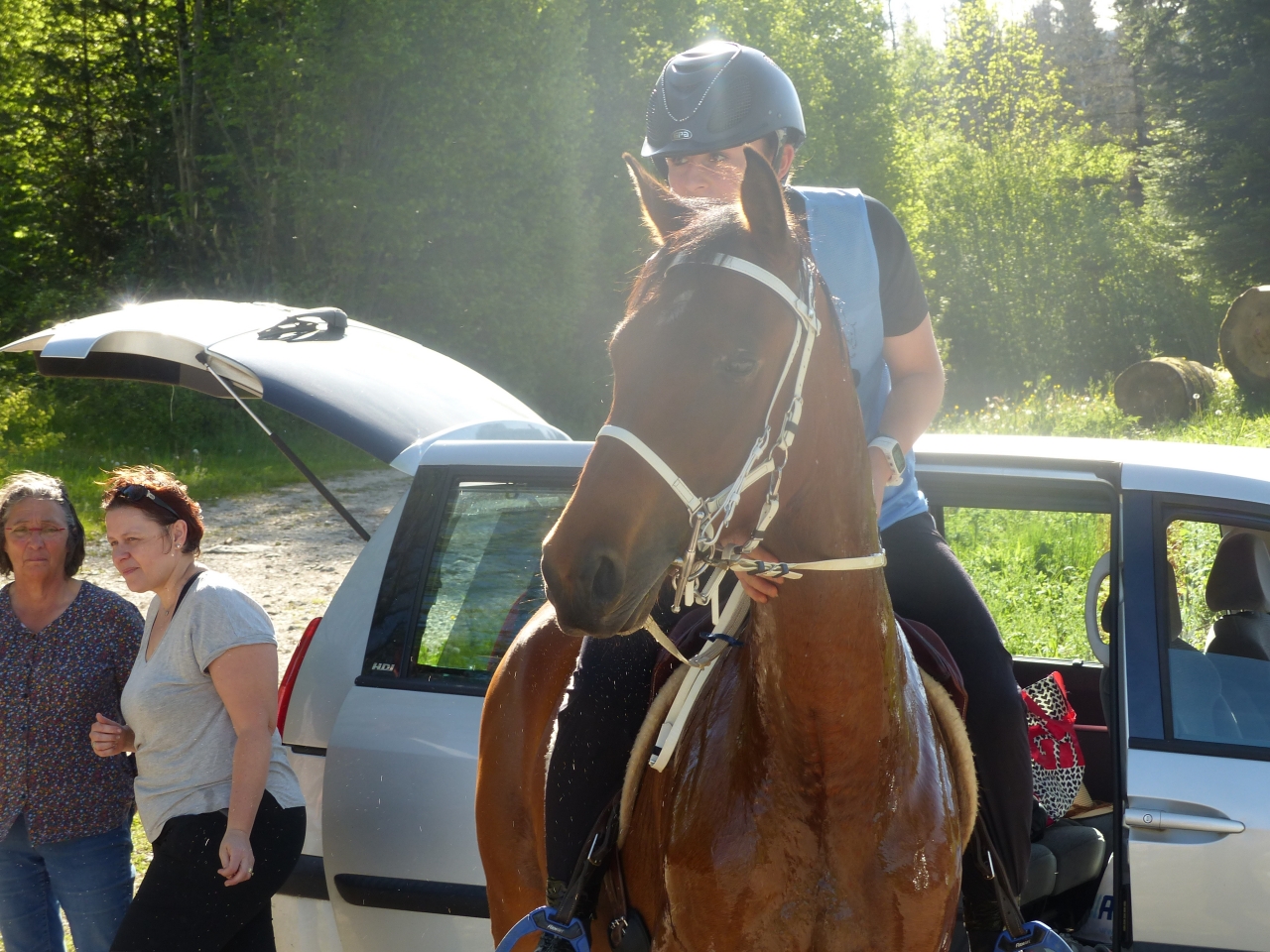 | Dire merci | la miss charge très bien et nous voilà de bonne heure sur le site car il fait une chaleur orageuse des plus étouffantes controle initial ok ![]() on prépare la belette ![]() et on rejoint un compagnon de route qui a du mal à partir seul il ne fait que 20km mais ce sera toujours une compagnie pour Java bon en fait il ne servira pas à grand chose, il ne passe pas devant ![]() ![]() ce ne sera pas très grave, Java assure ![]() ![]() arrivée à la deuxième assistance, un petit groupe s'est formé ![]() malgré la chaleur et la difficulté pour les jeunes chevaux de redescendre leur fc, ces premiers 22km sont validés, la miss mange bien pendant la pause |