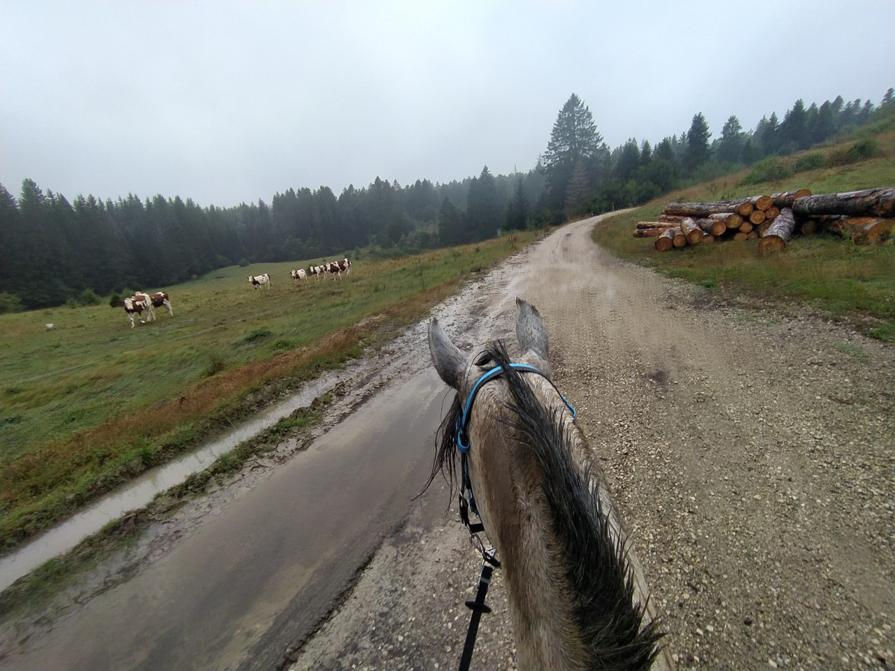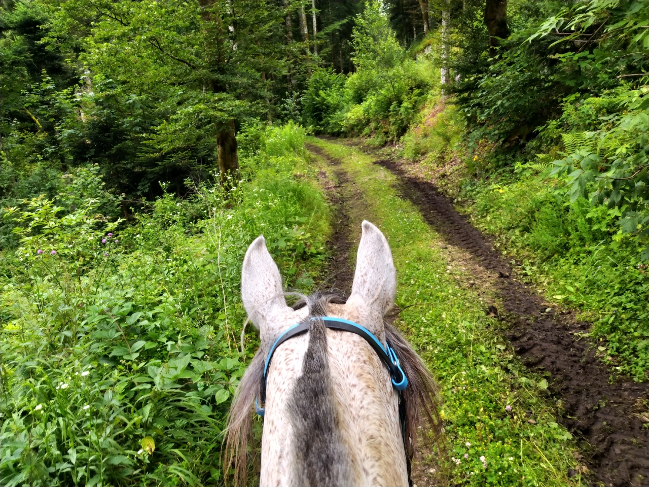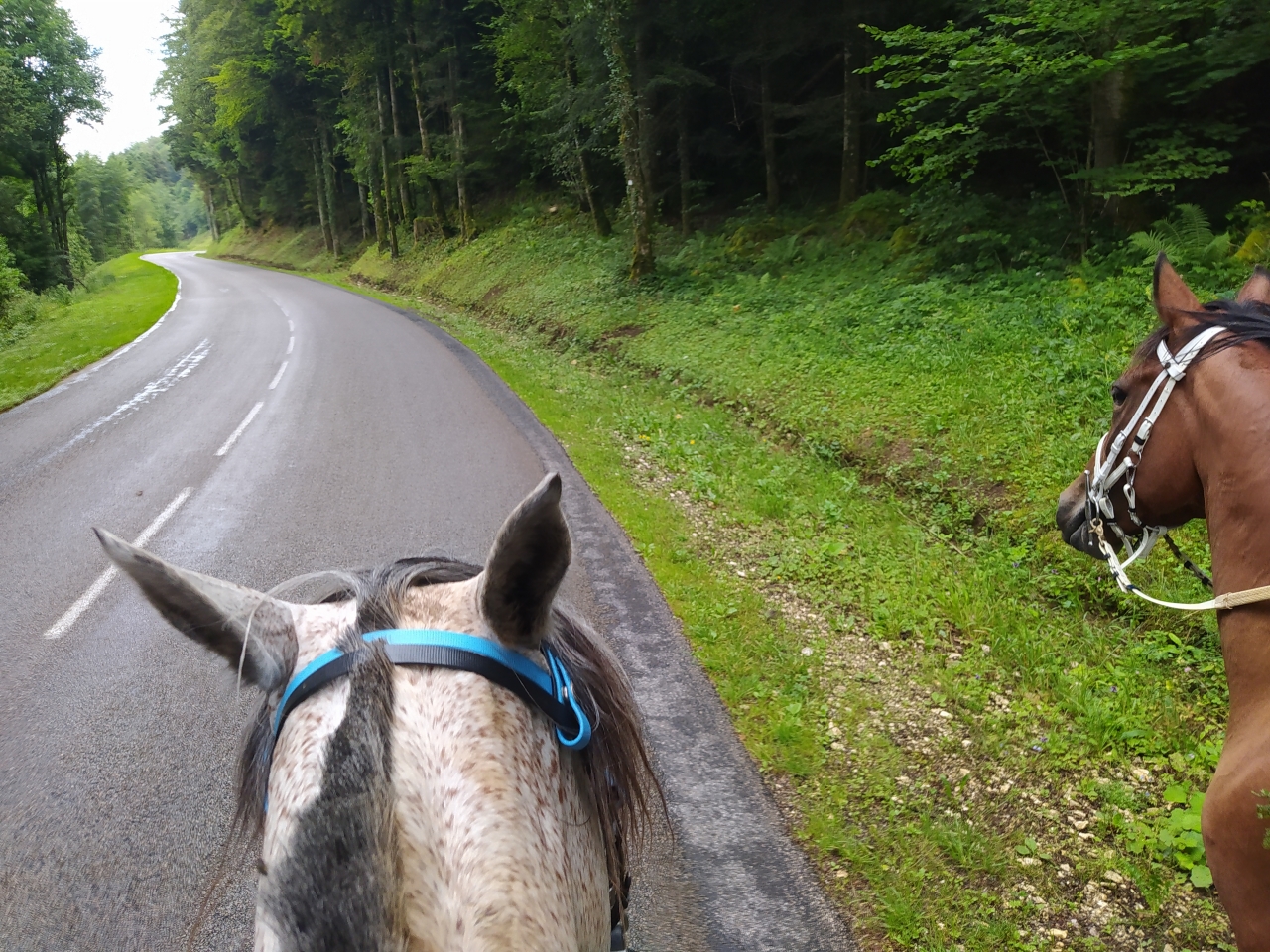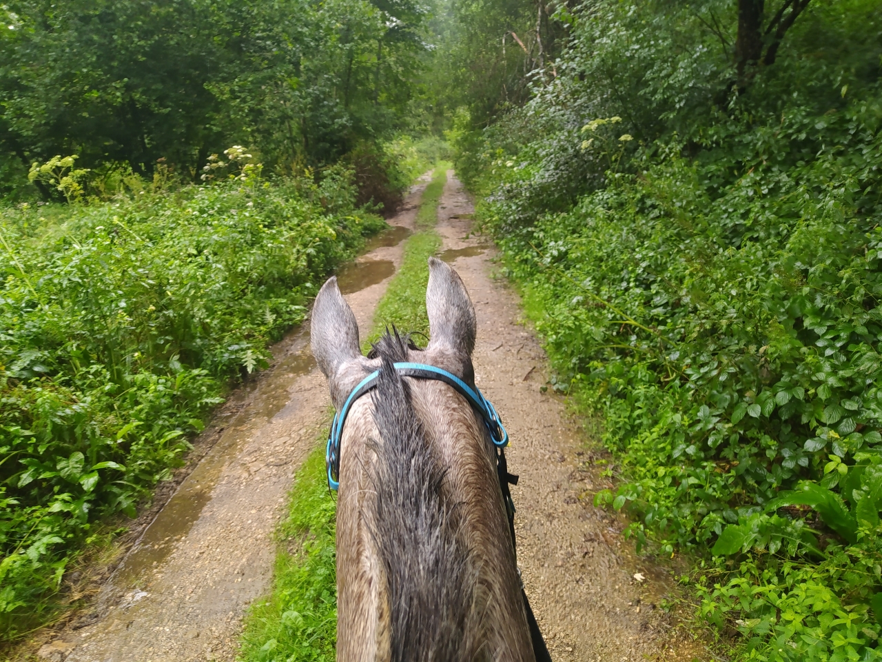 | Dire merci | retour jeudi de nos vacances en famille pour découvrir que Java a déferré d'un antérieur ![]() du coup c'est Naska et Quiara qui sont sorties mercredi avec M et sa maman tout s'est bien passé, Quiara n'a pas fait trop sa chiasse elle a juste blessée au passage de sangle mais vu le ventre qu'elle se paye... Dimanche matin c'était mon seul créneau pour monter et il faisait un temps... finalement j'y suis allée quand même c'était bien jusqu'à ce qu'on se fasse attaquer par des Kangols les chiens se sont mis à nous courser j'ai réussi à arrêter la jument (je me voyais déjà pas en haut de l'affiche mais bien dans le décor...) assez rapidement et elle s'est figée. Un des chiens venait au contact sur les postérieurs, j'ai regretté qu'elle tape pas ![]() évidemment le proprio s'est excusé mais bon ca fait pas tout ... quand on a des chiens cons sans rappel ben on les attache... non ? bref... on a continué la sortie mais évidemment elle avait la queue entre les fesses à sursauter pour rien, ca nous a un peu gaché la sortie déjà bien assez humide ![]() |