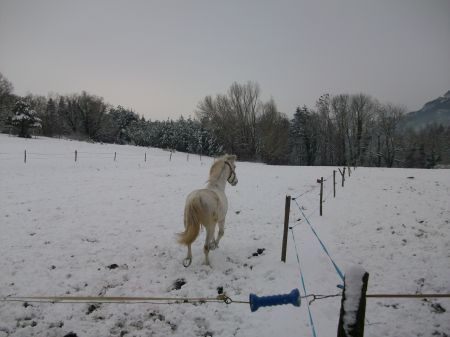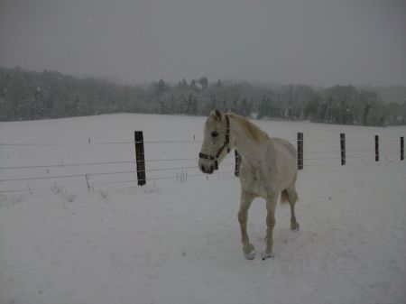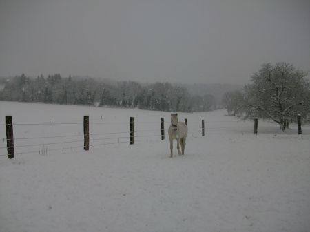 | Dire merci | Je me rappelle comme je me faisais plaisir à regarder les photos de neige d'autres forumeurs quand j'habitais dans un coin où il n'y en avait pas alors c'est avec plaisir que je contribue ici. Nous avons eu de la "vraie neige" pour la première fois aujourd'hui. Avant on ne dépassait pas les 5/10cm mais là on a eu 20cm et même 30 par endroit. C'est l'épaisseur idéale: juste assez pour que tout soit bien blanc mais pas trop non plus pour ne pas fatiguer les chevaux quand on part en balade Bon, nous n'avons pas le soleil mais on fait avec.Savannah, mon petit carambar élastique qui voit la neige pour la première fois cet hiver et qui adore ça: ![]() ![]() Les grands espaces ça donne envie de se bouger un peu. Mon bestiau lui il faut le motiver artificiellement dans le rond de longe ![]() Quand il y avait moins de neige, les vieux routiers qui rentrent à l'abri quand le vent se lève ![]() |