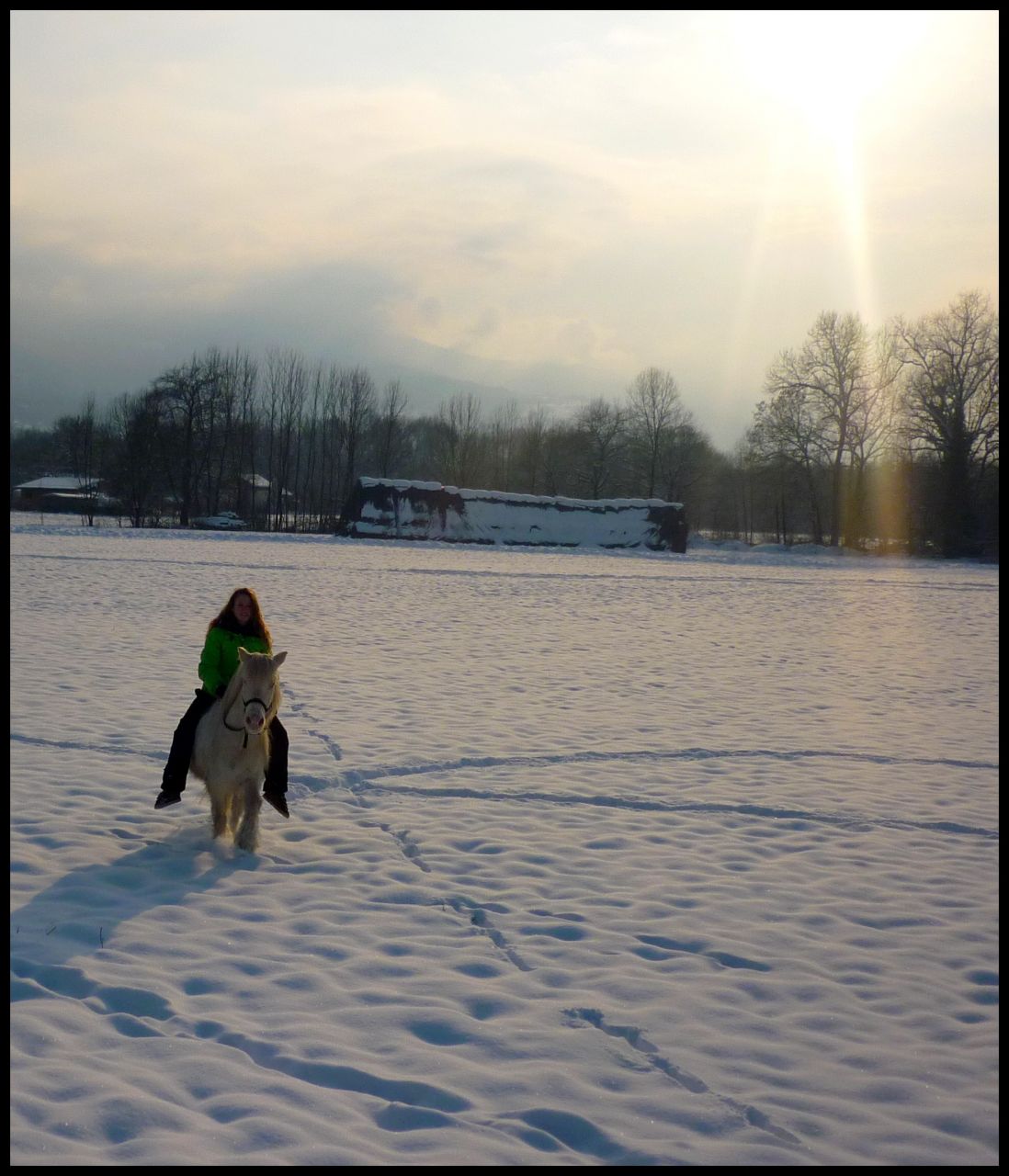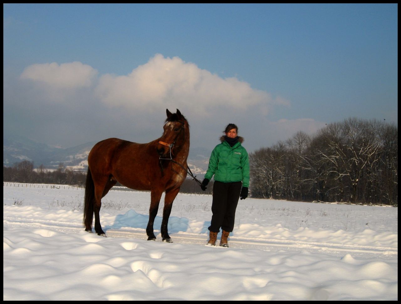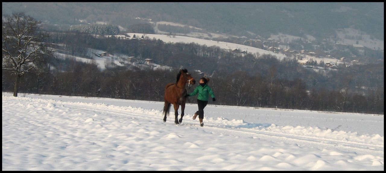 | Dire merci | Jolies photos ! Mais le cheval bai, il est en hackamore ? parce qu'au moment de la longe c'est direct branché sur la branche j'ai l'impression.... Perso je ne longerai pas dans la neige, même pour une photo, trop peur de la chute et compagnie.. |