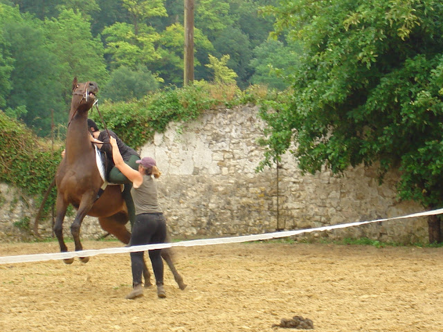 | Dire merci | Enceinte de 8 mois, puis plâtrée pendant 2 mois (oui, avec un bébé d'1 mois, pratique), je le laisse au repos, et il décolle : On bosse en main et à la longe, en mettant bcp les codes vocaux en place : Il devient plus respectueux : |