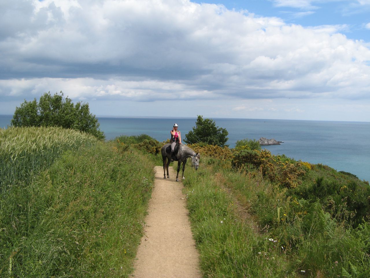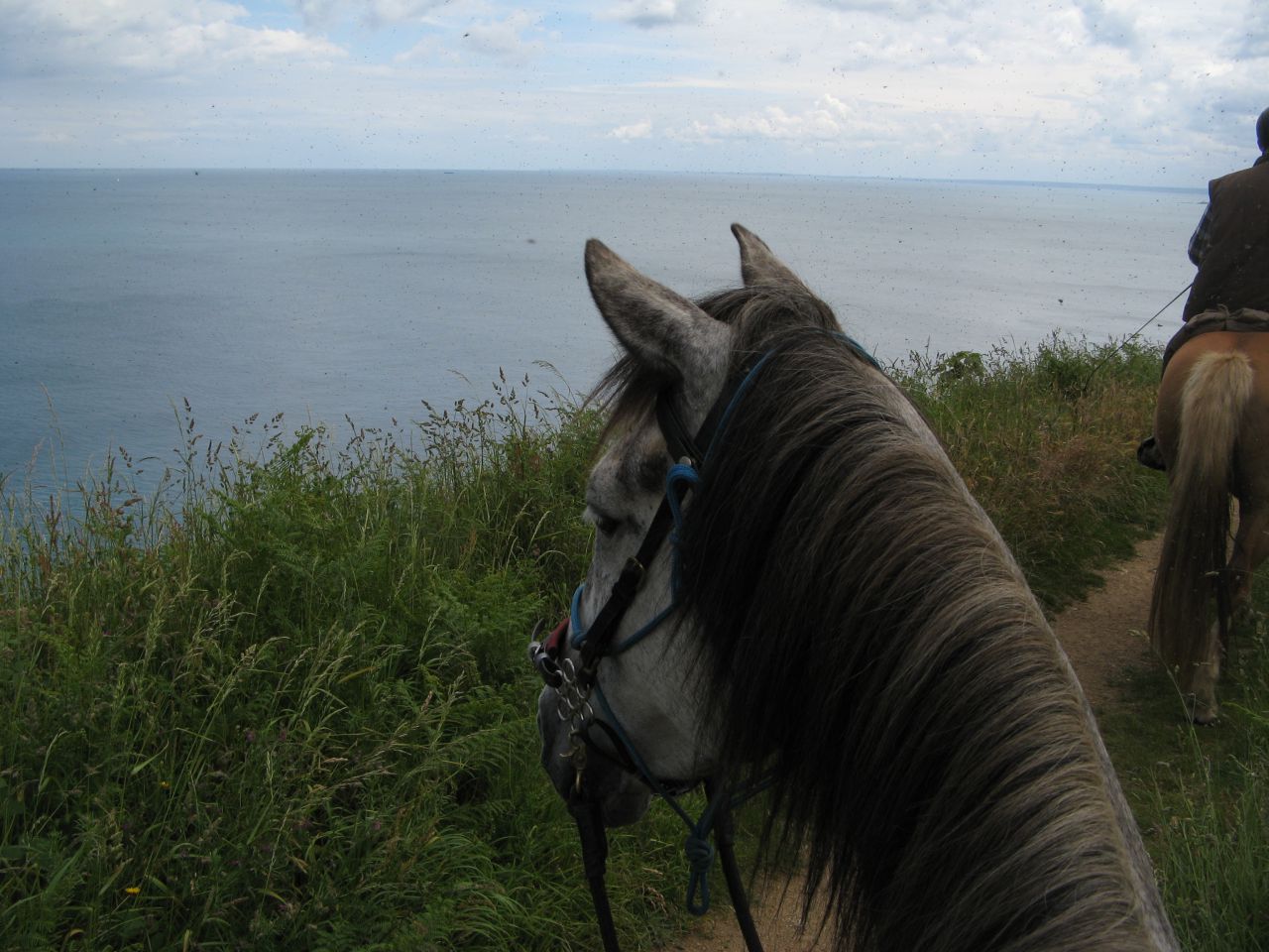 | Dire merci | Les falaises au loin![]() On sent tyrock complètement affolé ! (ça il a vite compris qu’il fallait profiter de chaque moment de pause ! )![]() La pause du midi ! première fois en ligne de corde pour tyrock, il a passé toute la pause à observer avec intérêt le ramdam que faisait un entier un peu plus loin, il a réussi à se rouler sans rester pendu, puis il a fini par se reposer un peu quand même ! ![]() Comme il était bien plus calme que le matin, j’ai pu lui mettre les hipposandales sans aucune difficulté ! On a marché 3 h le matin, et c’est reparti ! Les falaises… ![]() le chemin est carrément rocheux et ça grimpe ! Tyrock est en tête, il regarde bien ou il met les pieds et il grimpe avec un rythme très régulier ! Il ne semble pas fatigué ! On voit 2 petits points un peu plus bas, ce sont des chevaux partis juste après nous … ![]() Queiros après de longues hésitations à fini par entrer dans l’eau et maintenant il ne veut plus avancer il veut faire mumuse !! Tyrock à les oreilles à l’horizontal de chaque coté, en plus de lui donner un air très niais, je sais que c’est le signe qu’il n’est pas du tout rassuré et qu’il prend sur lui !! ![]() |