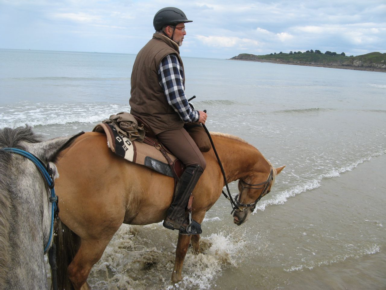 | Dire merci | Ce weekend, 2 jours de rando au programme pour tyrock et moi ainsi que queiros et mon père. C’est une rando test pour tyrock, pour voir son comportement et aussi pour voir s’il allait tenir la distance ! (36 km le 1er jour et 26 km le 2ème) c’est une rando organisée par une asso donc pas de bagages à porter ! Le samedi matin on arrive sur le lieu de départ vers 9h30, il y a déjà beaucoup de monde environ une cinquantaine de chevaux je pense et aussi des attelages ! On prépare les chevaux au van et on monte notre paddock pour ne pas avoir à le faire le soir ! Comme d’hab, tyrock ne tiens pas en place au van ! Il regarde tout les chevaux, je tente de lui mettre des hipposandales aux antérieurs mais il ne tiens tellement pas en place que j’abandonne !! Je mets les hippo dans les poches du tapis et tanpis pour lui on verra à la pause du midi si je lui mets ou pas ! On démarre à pieds par la traversée du village puis on se met en selle …, il y a de beaux chemins en herbe, on trotte pas mal au début, du coup tyrock se détend… sauf quand des chevaux arrivent derrière ! Il me fait à chaque fois un démarrage au galop, encore pire si par hasard les cavaliers qui arrivent derrière nous ont un chien ! Dans ces cas là j’essaye de me ranger sur le coté et de laisser passer ! Au bout des 2 jours, les démarrages ont été beaucoup moins violents et j’ai même réussi à n’avoir plus qu’un sursaut sur la fin du deuxième jour (il commençait surement à fatiguer ! ) Petite pause devant un château ! ![]() Sur la suite il y a pas mal de chemin caillouteux et pas mal de route, je sens que tyrock cherche un peu les bords, il va falloir que je lui mette les hipposandales le midi ! On arrive au bord de la mer avec de superbes points de vue ! ![]() Tyrock est intrigué par je ne sais plus quoi ? ![]() On a essayé d’alterner lui devant puis queiros devant, mais heureusement que j’avais mon stick car quand monsieur est tranquille derrière, il n’a pas vraiment envie de passer devant et il devient carrément sourd aux jambes ! Il faut à chaque fois le menacer d’une fessée pour qu’il consente à passer devant ! (pareil ça allait mieux le 2ème jour !) ![]() |