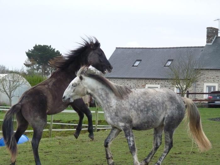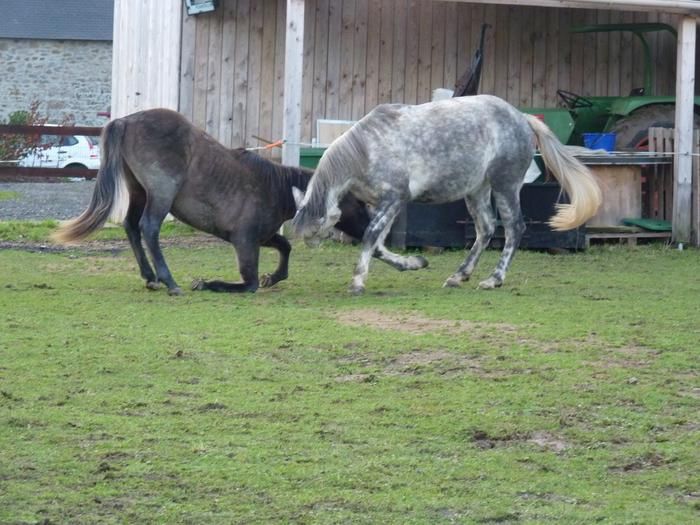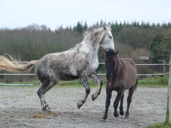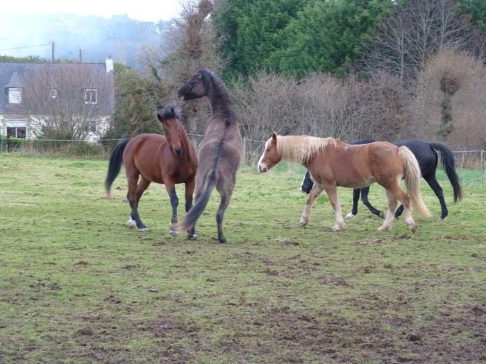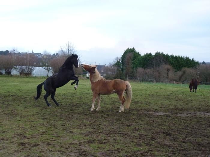 | Dire merci | Olly, oui ils jouent beaucoup ! C'est bien au moins ça les fais bouger ! Pour cashmere on a pas mal insisté sur le respect au début mais pour l'instant il est vraiment pas difficile, il a vite pigé qu'on était pas des copains de jeu ! la on insiste bien sur le pansage et les pieds ( il restait quelques zones sur les postérieurs ou il réagissait un peu mais la c'est ok ! ) du coup on a maintenant démarré les sorties en main avec ou sans copain ! Il est pour l'instant moins testeur que pouvais l'être tyrock au même âge ! Ouf ! ![]() Soleil, greco et fidjie font encore quelques balades mais rien de très intense ! Et effectivement ils se portent très bien ! Greco passe beaucoup de temps à jouer avec les jeunes c'est assez rigolo à voir ! Et toi quelles sont les nouvelles? Tu as toujours soleil ? |