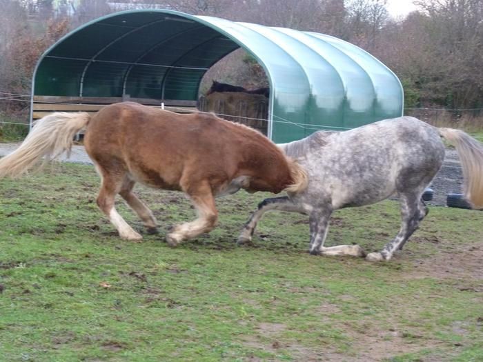 | Dire merci | Merci tout le monde !! Chapaval, on passe pas mal de temps a tout nettoyer en ce moment (1h tout les jours entre le ramassage de crottins et nourrir) du coup c'est propre mais on monte pas beaucoup à cheval en hiver ![]() Idole, ah moi aussi j'aimerai bien qu'ils jouent avec ! Le problème c'est que mon terrain est en pente donc je passe mon temps a aller chercher le ballon chez le voisin ![]() Merci maratre et norah ! |