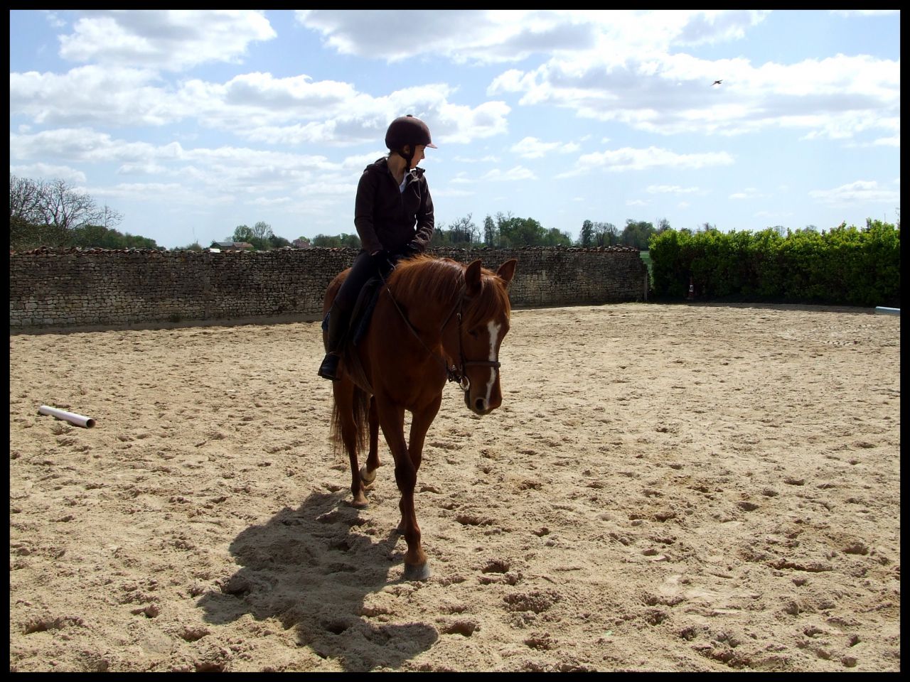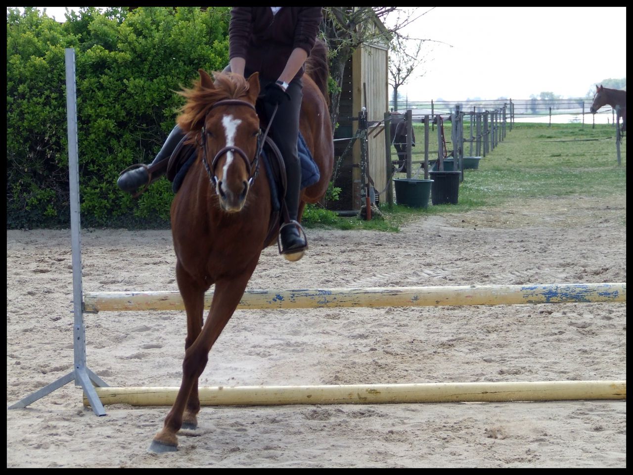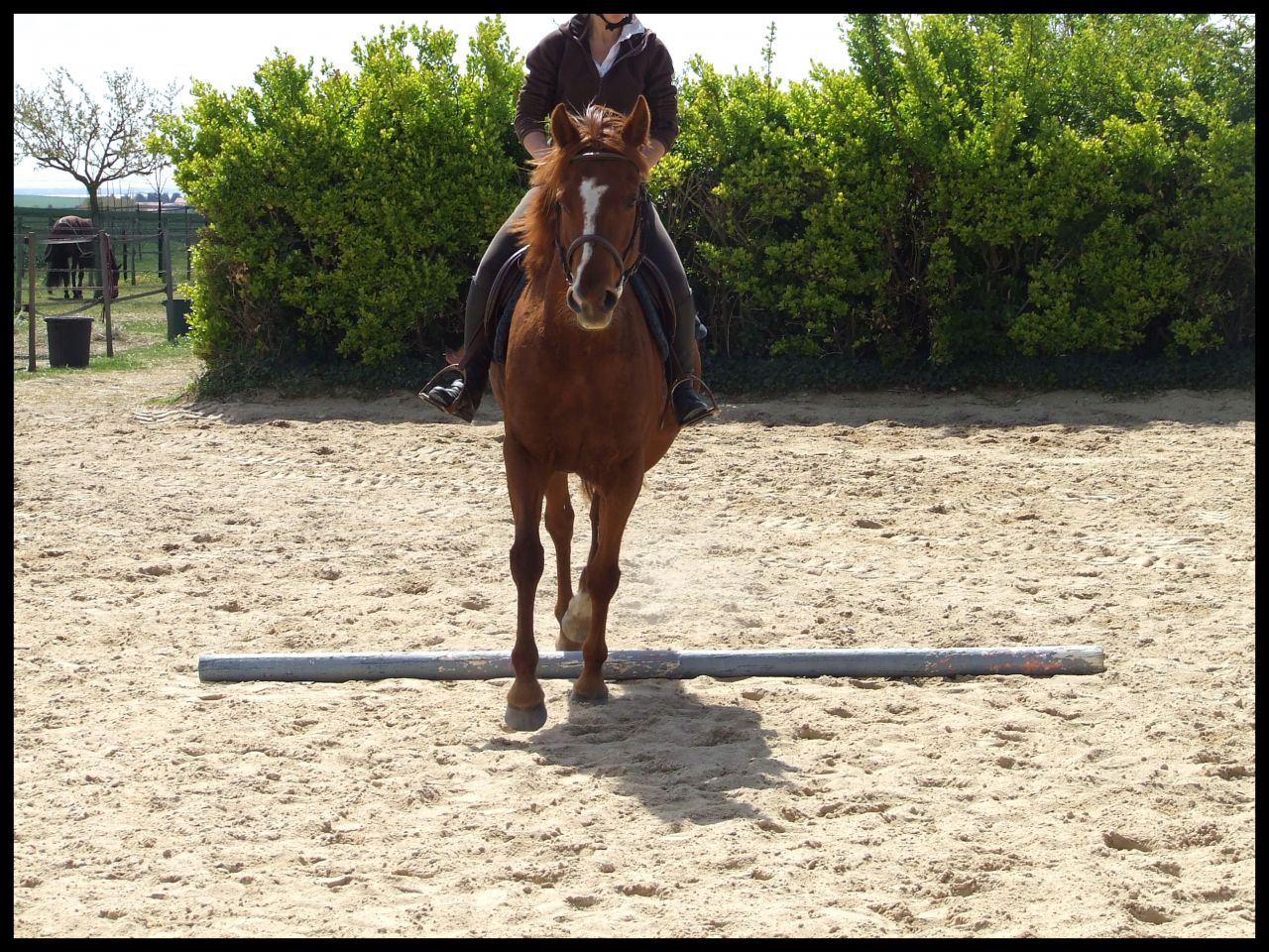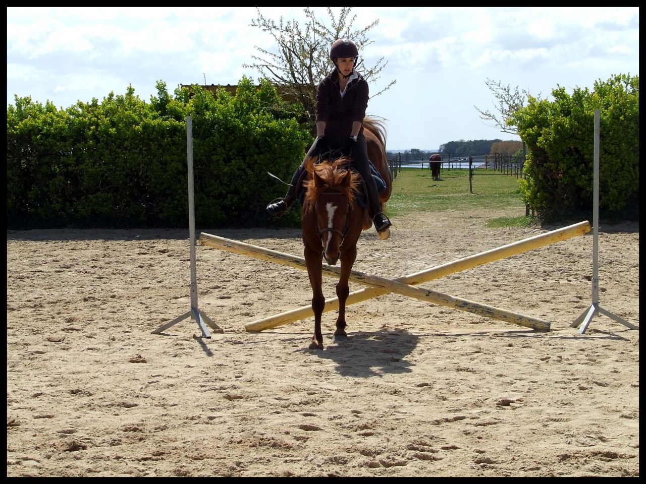 | Dire merci | Désolé hier soir au final je me suis démotivée j'étais complétement HS. News CP du 16 avril : Au final c'était un cours dressage mais avec des barres à sauter Si si je vous explique : en fait elle ma fait travailler la régularité, avec cet exercice ![]() En gros de droite à gauche c'était, barre au sol, petite croix (devenu petit vertical) et vertical un peu plus haut avec soubassement. Le but était de passer les élements à la suite, en intercalant, au debut un passage entre les élements avec rien du tout donc. Je sais pas si je suis très claire ( Faut dire que je suis reveillée depuis 10 min et que je suis toujours dans mon lit ) L'allure etc ne devait pas changer que ce soit le passage sur l'un des éléments ou le passage sans rien. Queen a été top !! Bon alors une fois encore c'était dans le sens de la largeur de la carrière du coup ça venait très treès vite surtout à main droite car moins d'équilibre. En plus de cet exercice et pour rajouter en difficulté je devais venir renes "longues" et me servir que de mes jambes pour maintenir la même cadence. Pas facile quand tu as une jument qui aime sauter Elle m'a décollé de ces sauts au début, quand vous allez voir ma tête sur les photos vous aller comprendre Pour passer le dos elle le passe ....Super fière de Queen car sur le dernier obstacle il y avait des soubassements, chose qu'elle n'a jamais fait. Et bien elle l'a passé nickel de chez nikel. Au premier passage elle a fait un tout petit truc mais ça venait de moi et du coup que je savais pas comment elle allait réagir. Le second saut très bien Voila pour le CP pas grand chose à raconter de plus. Vous verrez les photos (bon par contre yen a pas beaucoup beaucoup et elles ne sont pas top car ma copine ne sait pas trop se servir des APN) Ah et j'ai discuté avec ma prof selon elle si on continue comme ça on peut sortir cet été sur une petite épreuve. Le truc pour elle c'est qu'il faut absolument qu'on arrive à enchainer le tour dans un meilleur équilibre et sans repasser au trot du coup du fait d'une perte d'équilibre ![]() |