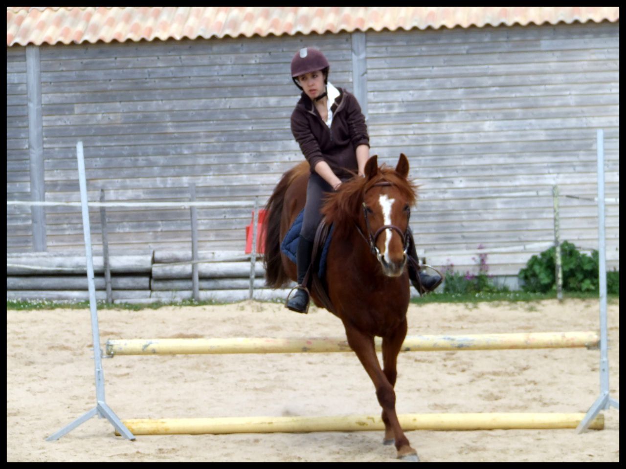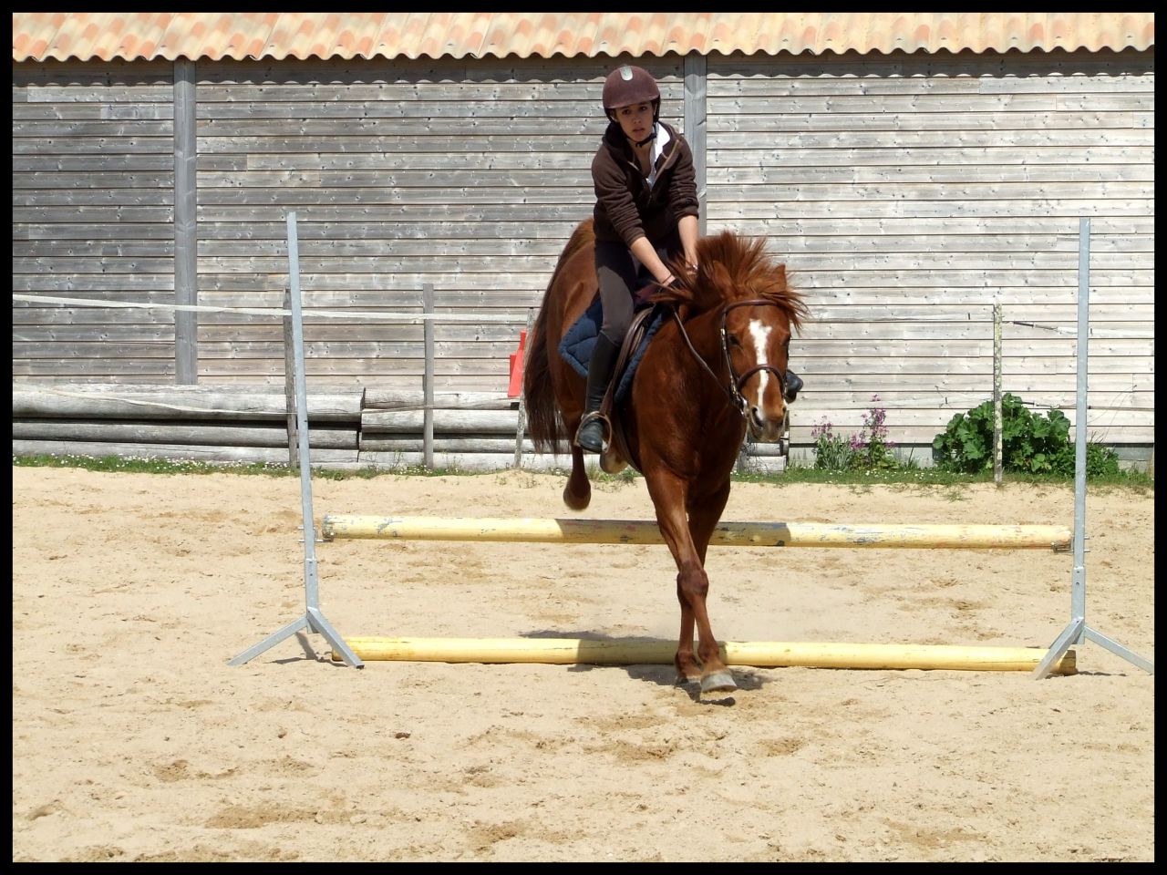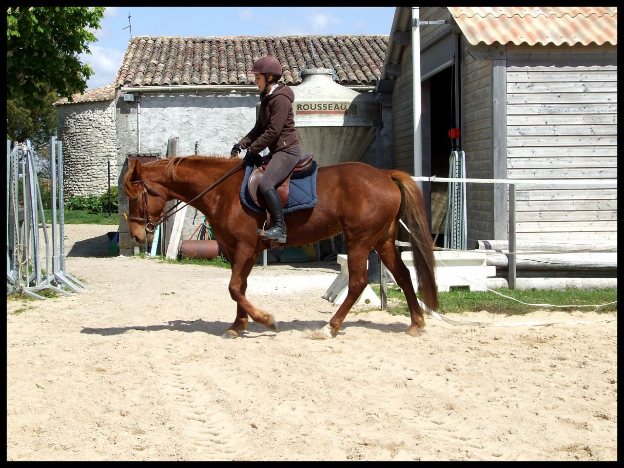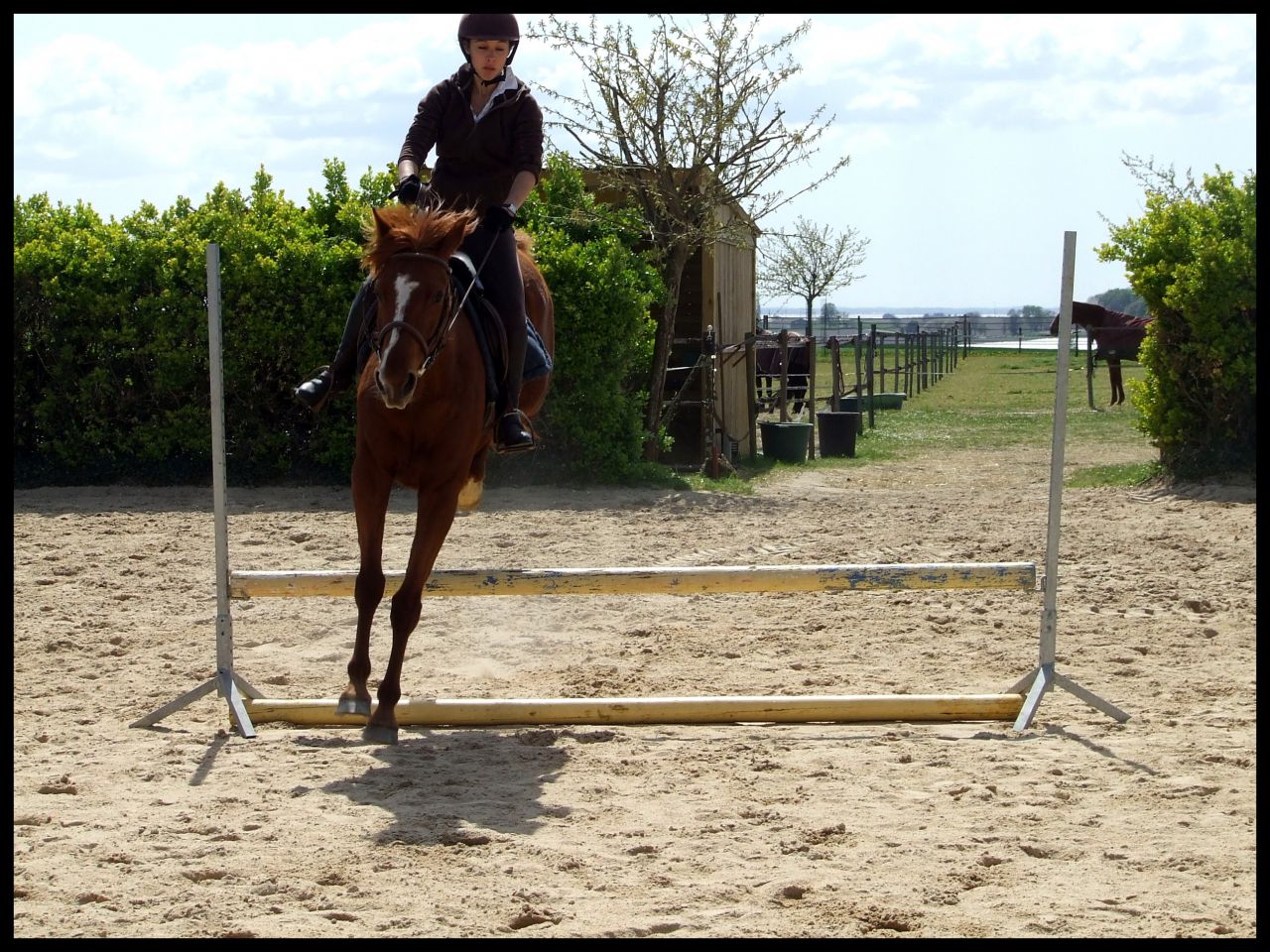 | Dire merci | Désolé hier soir au final je me suis démotivée j'étais complétement HS. News CP du 16 avril : Au final c'était un cours dressage mais avec des barres à sauter Si si je vous explique : en fait elle ma fait travailler la régularité, avec cet exercice ![]() En gros de droite à gauche c'était, barre au sol, petite croix (devenu petit vertical) et vertical un peu plus haut avec soubassement. Le but était de passer les élements à la suite, en intercalant, au debut un passage entre les élements avec rien du tout donc. Je sais pas si je suis très claire ( Faut dire que je suis reveillée depuis 10 min et que je suis toujours dans mon lit ) L'allure etc ne devait pas changer que ce soit le passage sur l'un des éléments ou le passage sans rien. Queen a été top !! Bon alors une fois encore c'était dans le sens de la largeur de la carrière du coup ça venait très treès vite surtout à main droite car moins d'équilibre. En plus de cet exercice et pour rajouter en difficulté je devais venir renes "longues" et me servir que de mes jambes pour maintenir la même cadence. Pas facile quand tu as une jument qui aime sauter Elle m'a décollé de ces sauts au début, quand vous allez voir ma tête sur les photos vous aller comprendre Pour passer le dos elle le passe ....Super fière de Queen car sur le dernier obstacle il y avait des soubassements, chose qu'elle n'a jamais fait. Et bien elle l'a passé nickel de chez nikel. Au premier passage elle a fait un tout petit truc mais ça venait de moi et du coup que je savais pas comment elle allait réagir. Le second saut très bien Voila pour le CP pas grand chose à raconter de plus. Vous verrez les photos (bon par contre yen a pas beaucoup beaucoup et elles ne sont pas top car ma copine ne sait pas trop se servir des APN) Ah et j'ai discuté avec ma prof selon elle si on continue comme ça on peut sortir cet été sur une petite épreuve. Le truc pour elle c'est qu'il faut absolument qu'on arrive à enchainer le tour dans un meilleur équilibre et sans repasser au trot du coup du fait d'une perte d'équilibre ![]() |