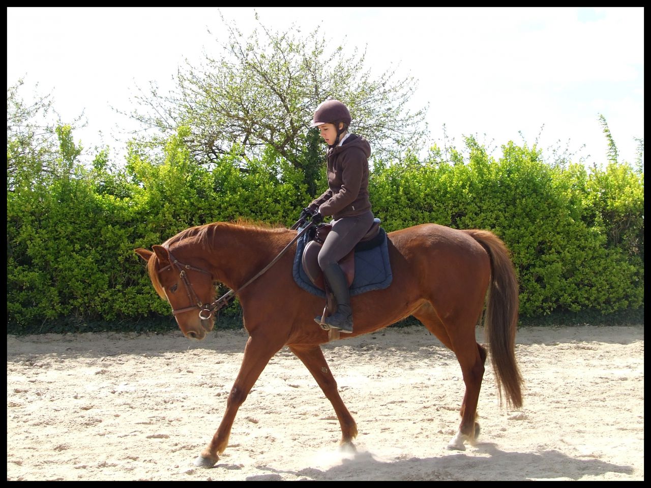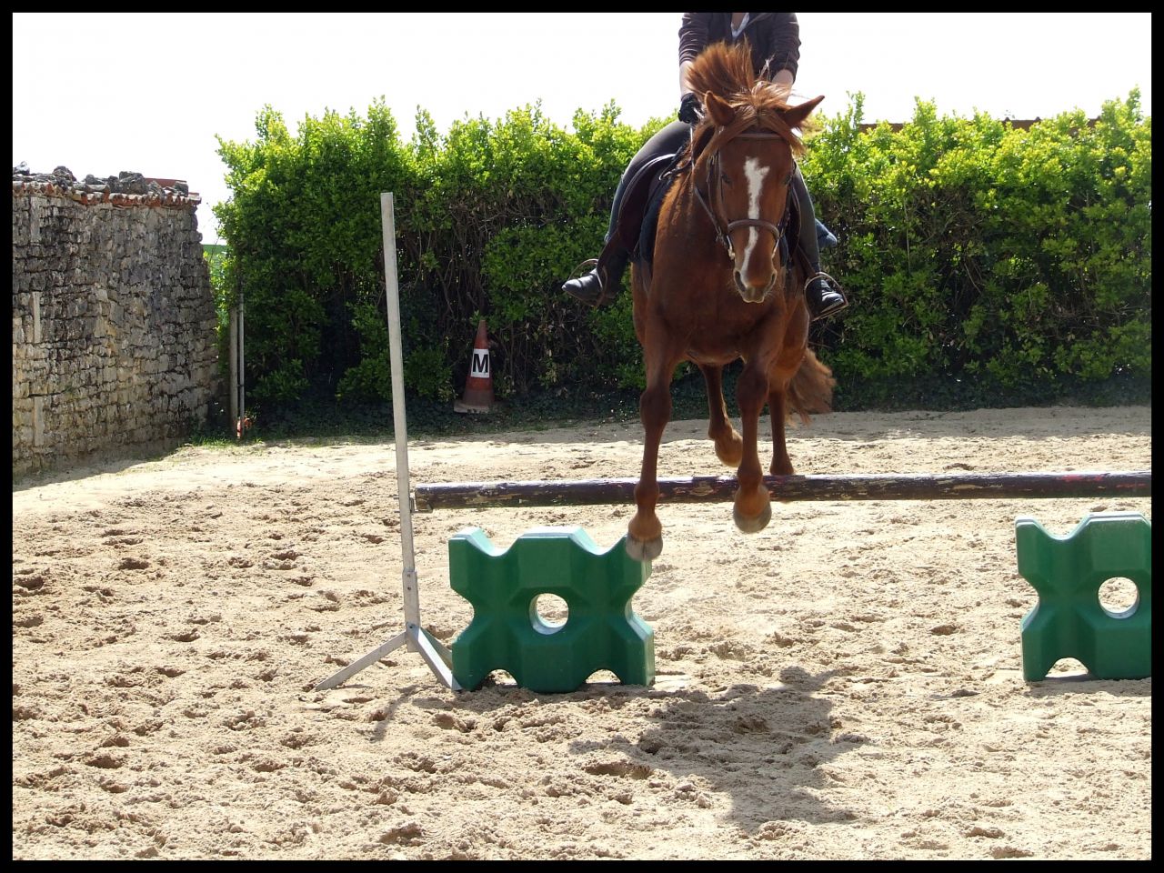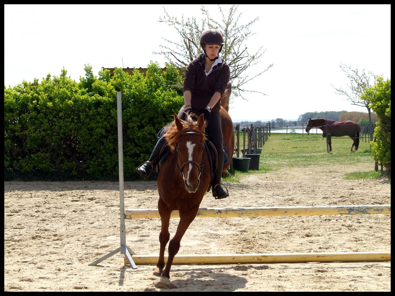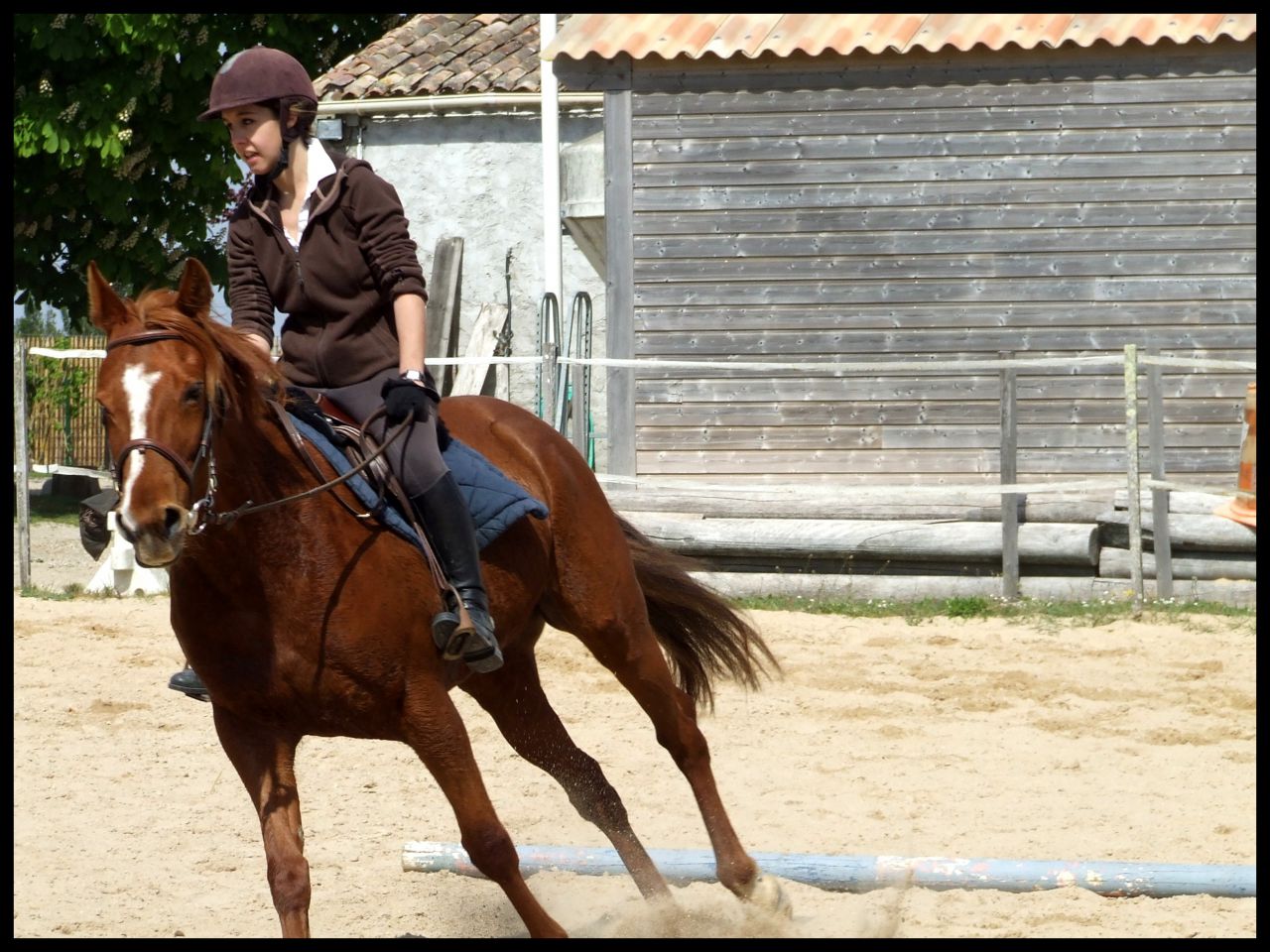 | Dire merci | Désolé hier soir au final je me suis démotivée j'étais complétement HS. News CP du 16 avril : Au final c'était un cours dressage mais avec des barres à sauter Si si je vous explique : en fait elle ma fait travailler la régularité, avec cet exercice ![]() En gros de droite à gauche c'était, barre au sol, petite croix (devenu petit vertical) et vertical un peu plus haut avec soubassement. Le but était de passer les élements à la suite, en intercalant, au debut un passage entre les élements avec rien du tout donc. Je sais pas si je suis très claire ( Faut dire que je suis reveillée depuis 10 min et que je suis toujours dans mon lit ) L'allure etc ne devait pas changer que ce soit le passage sur l'un des éléments ou le passage sans rien. Queen a été top !! Bon alors une fois encore c'était dans le sens de la largeur de la carrière du coup ça venait très treès vite surtout à main droite car moins d'équilibre. En plus de cet exercice et pour rajouter en difficulté je devais venir renes "longues" et me servir que de mes jambes pour maintenir la même cadence. Pas facile quand tu as une jument qui aime sauter Elle m'a décollé de ces sauts au début, quand vous allez voir ma tête sur les photos vous aller comprendre Pour passer le dos elle le passe ....Super fière de Queen car sur le dernier obstacle il y avait des soubassements, chose qu'elle n'a jamais fait. Et bien elle l'a passé nickel de chez nikel. Au premier passage elle a fait un tout petit truc mais ça venait de moi et du coup que je savais pas comment elle allait réagir. Le second saut très bien Voila pour le CP pas grand chose à raconter de plus. Vous verrez les photos (bon par contre yen a pas beaucoup beaucoup et elles ne sont pas top car ma copine ne sait pas trop se servir des APN) Ah et j'ai discuté avec ma prof selon elle si on continue comme ça on peut sortir cet été sur une petite épreuve. Le truc pour elle c'est qu'il faut absolument qu'on arrive à enchainer le tour dans un meilleur équilibre et sans repasser au trot du coup du fait d'une perte d'équilibre ![]() |