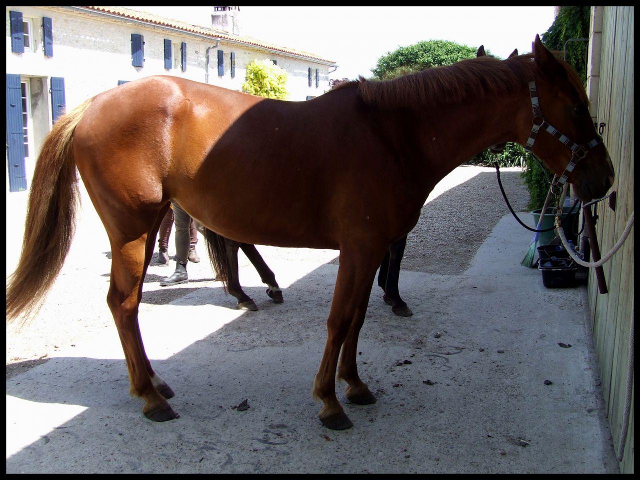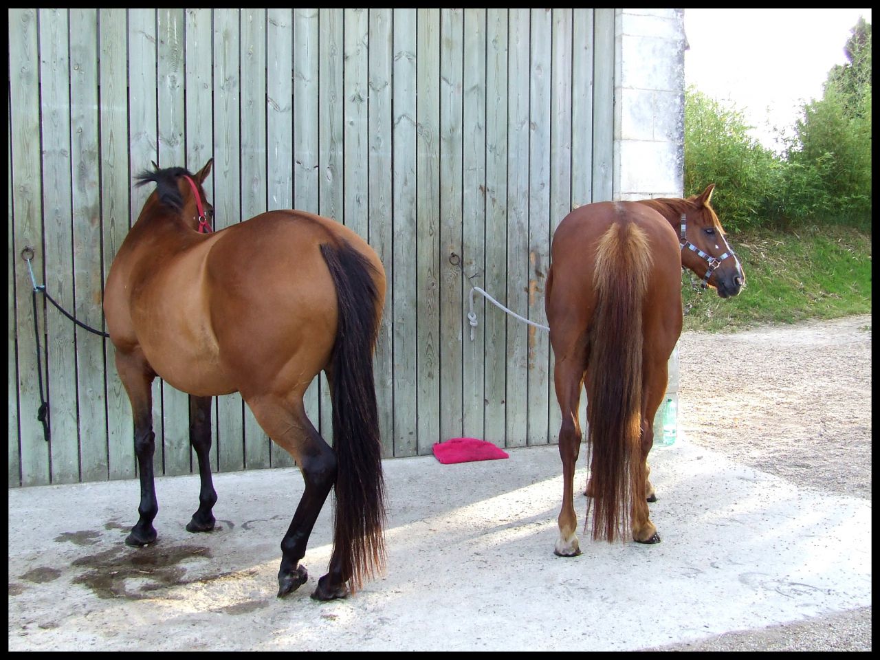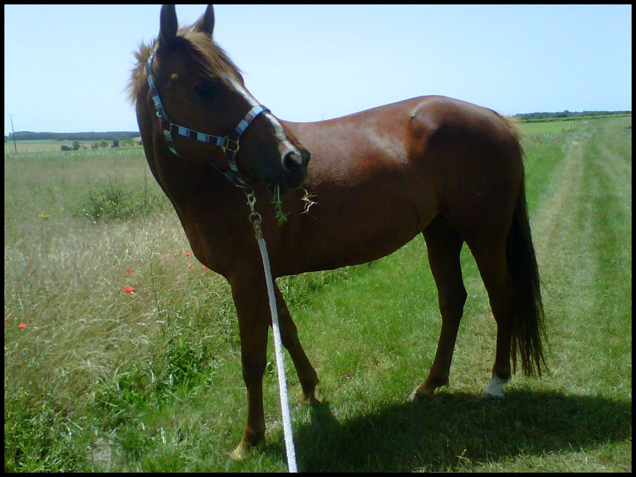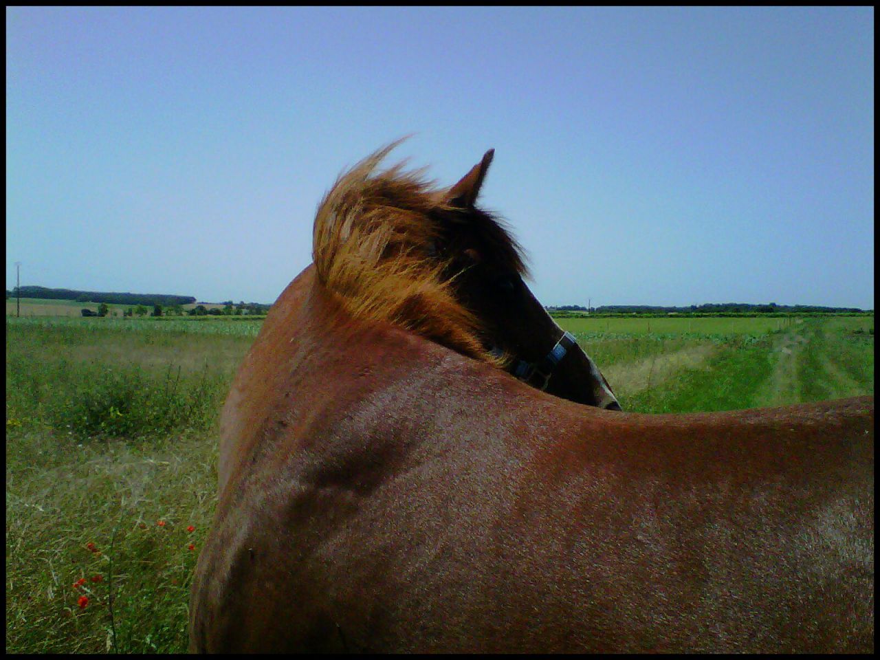 | Dire merci | Maintenant que Zenzile est partie sous la douche je peux blablater ici News : Balade du dimanche 24 juin Je suis partie avec I avec qui je pars tout le temps. Ca a commencé à déconner pour Queen au bout de 5 minutes C'est bien simple elle qui n'a jamais eu peur des voitures là arrivé à la grande route qu'il fallait longer, elle a stopé net, puis reculer en crabe ou en déplacement lattéraux sur bien 200m .... Dans ma tête je me dis cool la balade si ça commence comme ça ... Bref en fait elle a simplement eu peur du flot continue de voiture (tout le monde allait à la plage) et du coup du bruit. Du coup comme impossible de la faire aller en avant en étant dessus, je décide de descendre et passer à pied la partie longeant la route, en plus au bout il faut traverser un tunnel et ça elle n'a jamais fait. Bref ça fini par passer et à peu pres dans le calme je félicite et encourage beaucoup puis je remonte un peu plus loin. Au retour, je reste à cheval le tunnel passe impec, et la route toujours un peu regardante mais pas folle comme à l'aller. Les juments sont top sur le reste de la balade de prés de 14km. Queen a un pas juste adorable un pas de balade quoi et pas un pas sur ressort (celui là elle me le sortira en fin de balade )Et le passage de trot là encore elle a été plus que bien. Pas a tirer comme une folle furieuse de trotteuse Bon par contre gros soucis elle se pointe de plus en plus et visiblement de plus en plus haut Je ne laisse pas passer et elle se prend un claque entre les 2 oreilles à chaque tentative. A la fin ça aller déjà un peu mieux elle tentait encore mais moins fort I m'a dit qu'elle allait m'offrir une tapette à mouche Ah et je vous ai pas dit en cadeau de bienvenue quand je suis allée la cherchée au prés j'ai un le droit à un magnifique coup de tête de le nez Le truc bien assommant quoi ... D'ailleurs j'ai toujours mal ... Bref entre ça et les cabrés heureusement qu'elle s'est rattrapé sur le reste ![]() |