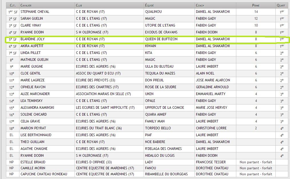 | Dire merci | ... ça devient aussi un poney de concours !! Après 6 ans d'attente, de travail, de jours avec et de jours sans, a 9 ans notre rêve est enfin devenu réalité, nous voilà sur notre premier tour ensemble. Une complicité comme jamais je n'avais eu et qui va continuer à grandir je l'espère. Une Queen au top de sa forme et qui s'amuse clairement sur le terrain ! Alors je voudrais juste lui dire merci d'être là, merci de me faire confiance et surtout merci d'être ce que tu es avec tes qualités et même tes défauts. ![]() ![]() Page 144 : Résumé séance van Page 145 : Photos séance coiffeur Page 146 : Résumé séance de reprise Page 147 : Résumé balade en tête à tête de 40 minutes Page 149 : Résumé séance saut Page 150 : Photos inutile au pré Page 151 : Résumé séance éperons + Vidéo détente longe + photos essayage séchante Page 152 : Vidéo Longe Page 153 : Résumé séance départ au galop sur les hanches Page 154 : Résumé séance saut "Le sable ça croustille sous la dent" Page 156 : Sieste sous un ciel gris Page 157 : Futurs achats pour Queen + résumé séance plat qui fait rêver Page 160 : Photos cheval boueux + comparatives Page 161 : Vidéos séances plat et longe Page 165 : Résumé balade + séance barres au sol 21m + séance saut enchainement 2 barres (Schèma) Page 166 : Résumé séance van + séance plat Page 167 : Résumé séance plat + plusieurs séances van + passage ostéo avec goûter aux écuries Page 168 : Photos au pré et des pieds + vidéo arrivée au pré Page 170 : Résumé balade + résumé plat + résumé longe Page 172 : Résumé balade 25km + longe Page 173 : Plusieurs schémas d'enchainement CSO + résumé 1er enchainement Page 174 : Résumé séance van + résumé des déboires aux écuries + photos bonus au pré Page 175 : CR ostéo + photos au pré + CR phase 1 post ostéo Page 176 : Photos au "modèle" + Résumé vidéos et photos séance plat + vidéo bonus Page 177 : Résumé et vidéos séance gymnastique sur les barres Page 178 à 180 : Divers résumés et vidéos pour préparation concours Page 181 : Photos + vidéos de notre 1er concours !!! Message édité le 02/09/13 à 21:41 |