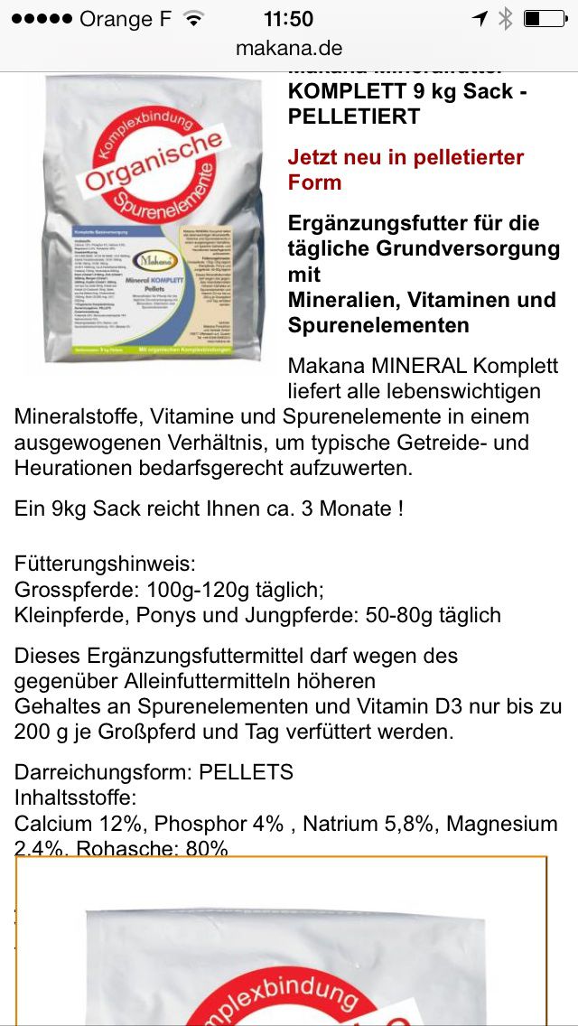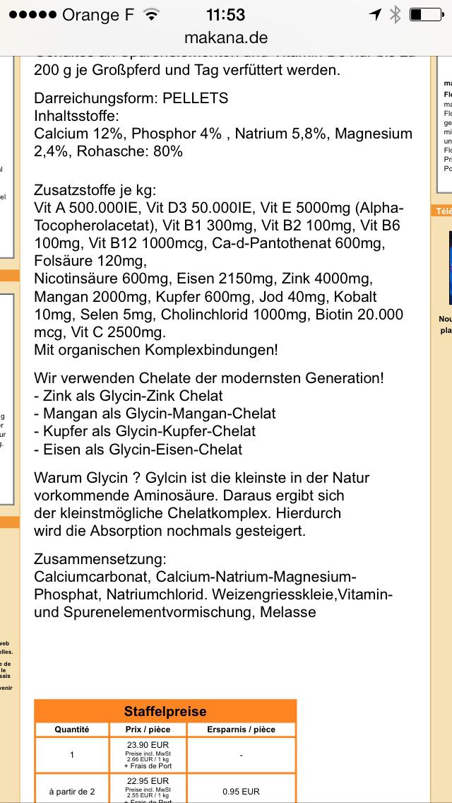 | Dire merci | 23.90 € les 9kg ( mais frais de port 11€) Un sac pour 3 mois environs 50-80g/ petit cheval/ j C'est allemand mais la compo se pige ![]() [/url] |