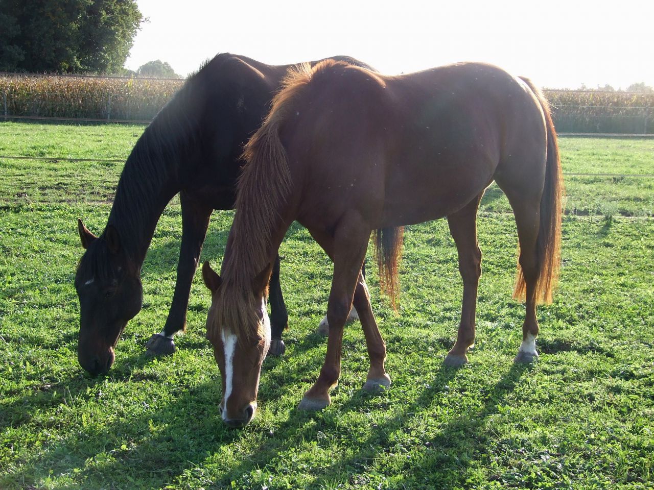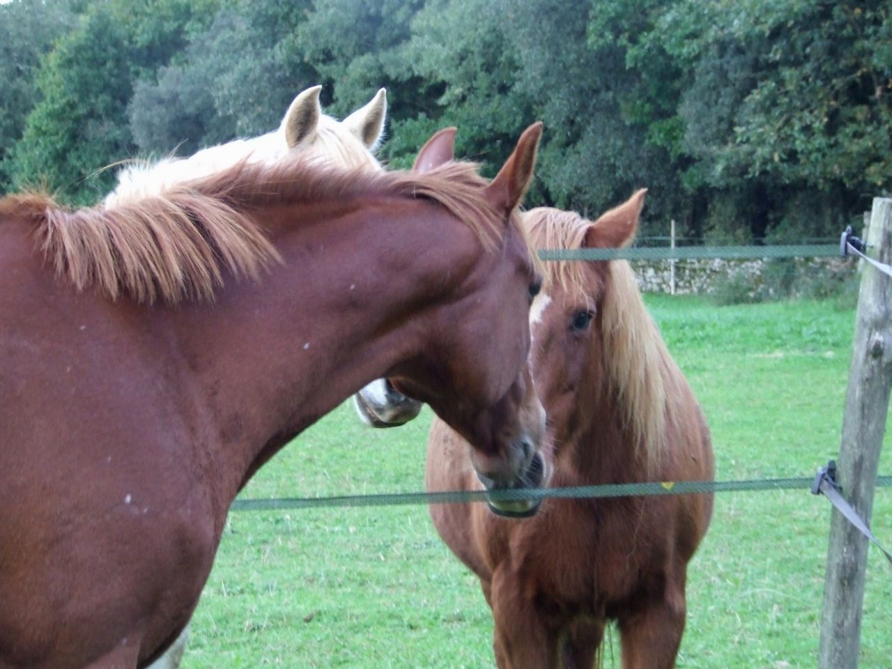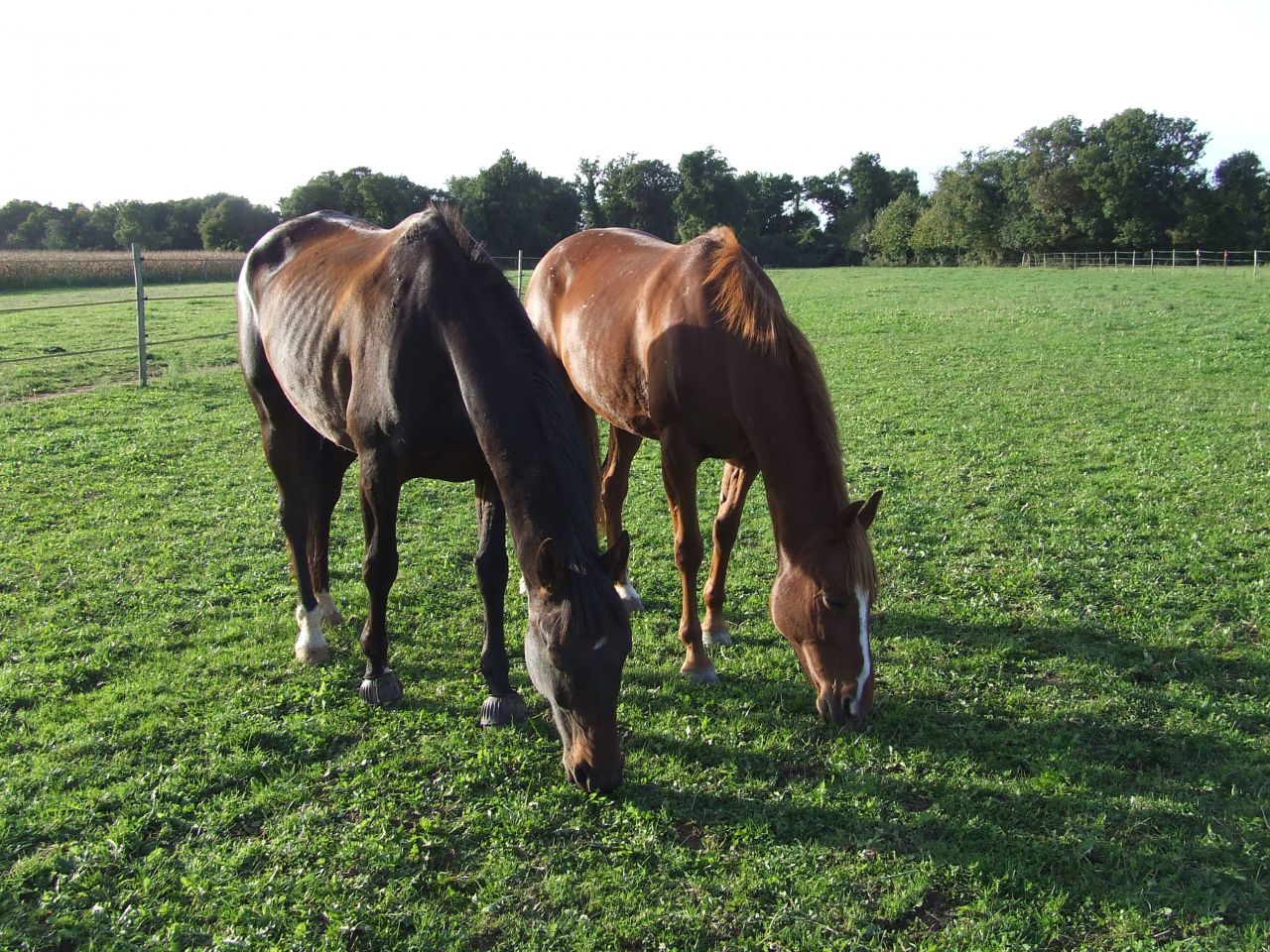 | Dire merci | ** suite ** Trajet d'un tout petit peu moins d'une heure. Elle commence à un tout petit peu se caler dans les virages donc c'est bien. Arrivée aux nouvelles écuries, comme d'habitude on sort vite de la voiture pour vite ouvrir car elle s'impatiente treès vite parfois, et descend très très vite aussi donc seau de granulé à la tête pour changer les idées le temps que tout soit ouvert derrière. Elle a voulu reculer avant la barre de recul mais j'ai secoué le seau et oh miracle Après on est descendu assez calmement. Une fois dehors même pas henni, toute toute calme mais vraiment !! Un peu mouillée mais vraiment rien de méchant, seulement base de l'encolure. On décide d'aller directement au pré. Sur le chemin, une stagiaire va chercher son nouveau copain, qui lui n'ont plus ne connait pas le pré. Ca j'ai vraiment trouvé ça top qu'ils aient attendu que Queen arrive pour les mettre tous les 2 en même temps dans le pré comme ça il n'y avait pas le soucis de "tu arrives dans MON pré" ![]() Et du coup ça c'est super super bien passé, limite dessus Ils se sont même pas calculé. C'est parti un tout petit peu au trot voir les voisins de chaque côté du pré et voilà. Ils se sont quand même senti à un moment mais aucune réaction même pas un couinement !J'y suis retourné à 18h30 pour vérifier que tout aller bien et donné les minéraux. Elle était à la porte gentillement car le copain était avec sa propriétaire. Elle a pas trop voulu de mon seau carottes/minéraux je pense qu'elle a passé sa journée le nez dans l'herbe et puis elle avait mangé sa ration vers 17h donc le ventre devait bien être plein J'ai 2 ou 3 photos d'hier soir en attendant de meilleure ![]() |
