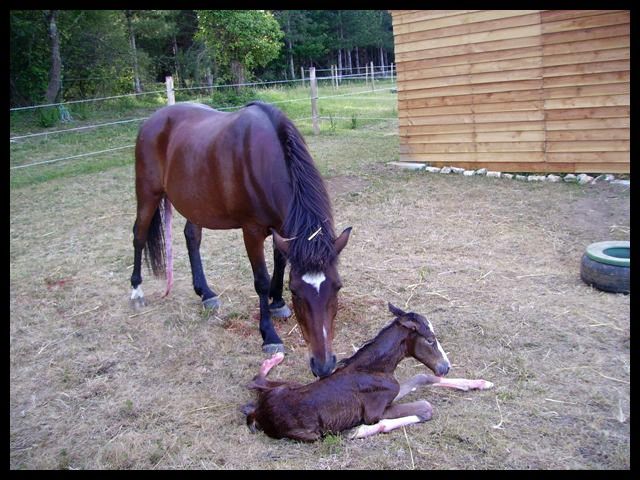 | Dire merci | Alors des nouvelles, petit bouchon est une fille de caractère deja bien visible. Elle a déja bottée Et passe deja sous les fils, et va manger au calme plus loin que maman sous les pommiers. ah et c'est aussi une vraie folle dans le près apparemment |