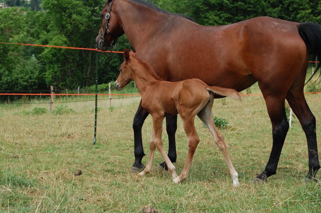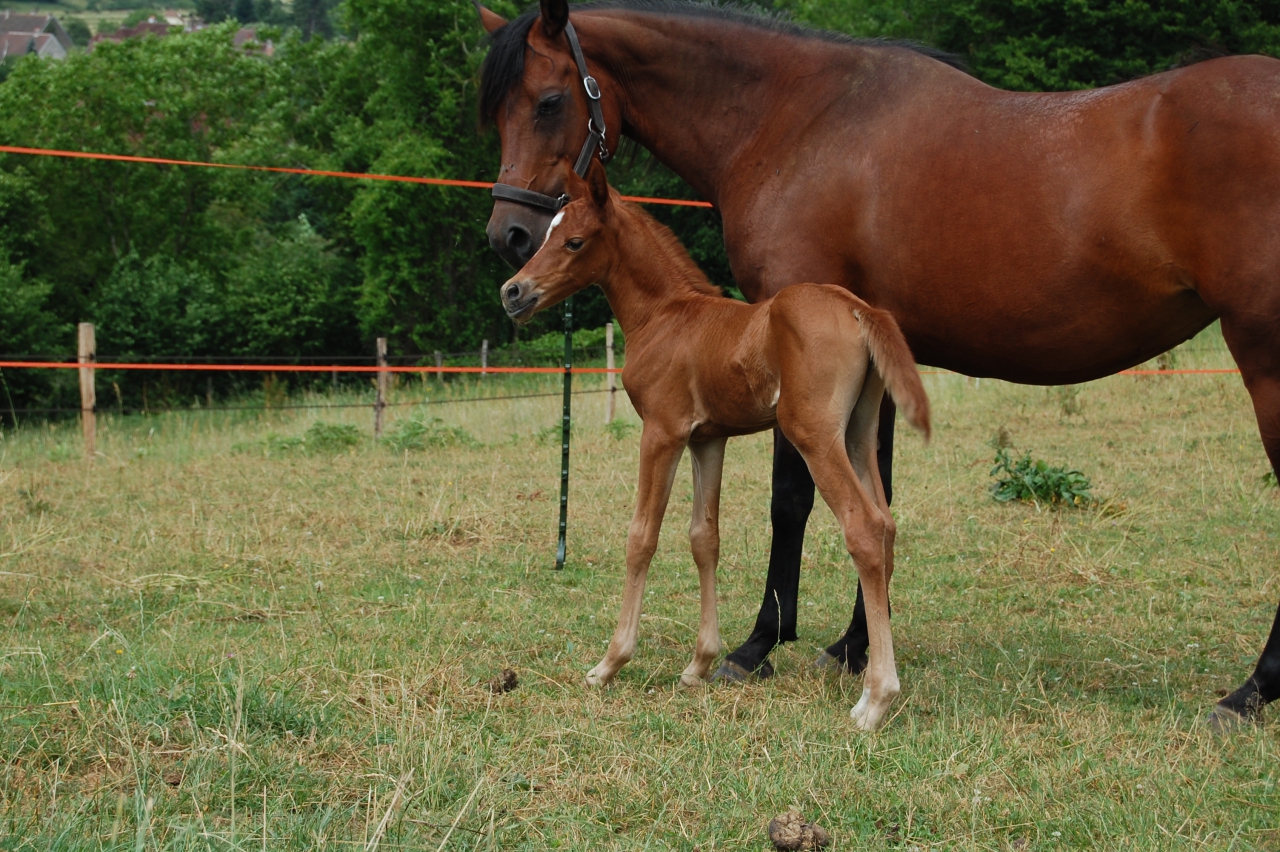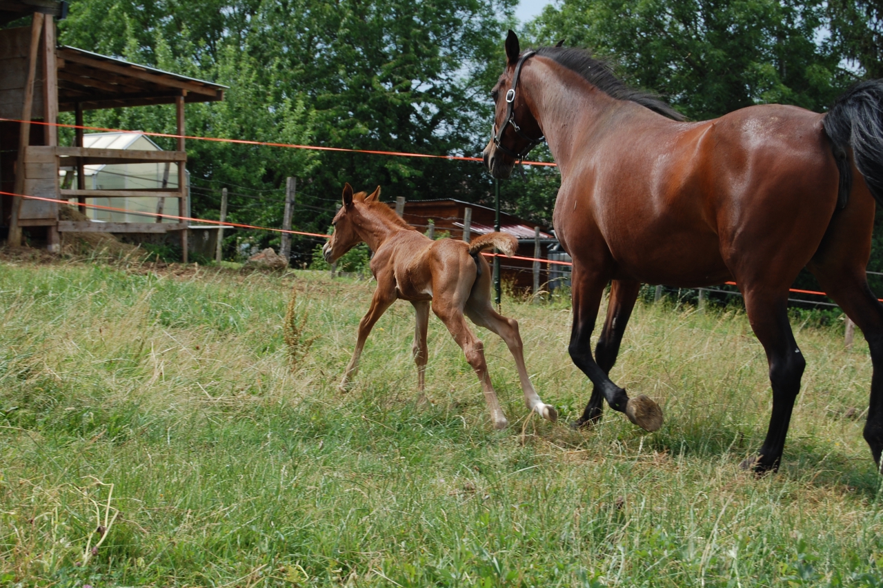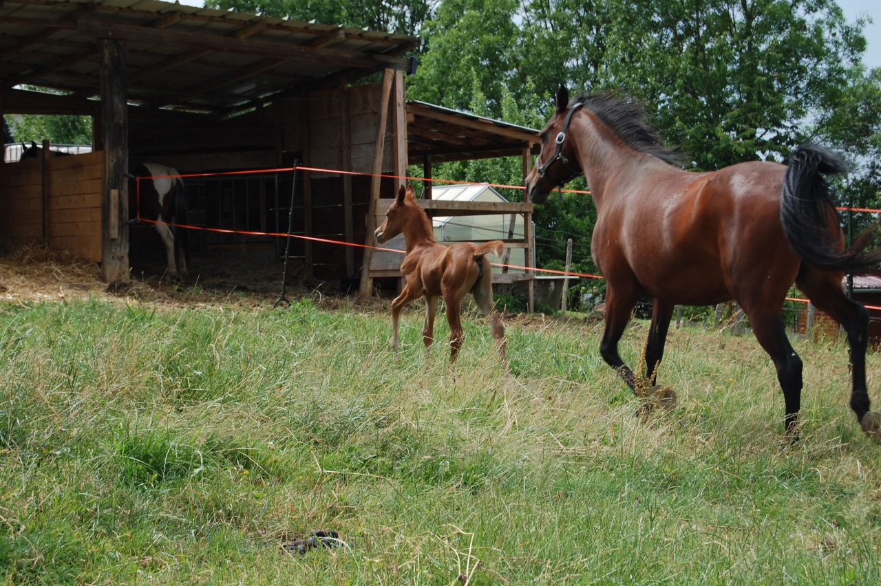 | Dire merci | De toute façon, pour sortir de l'alezan, il faut que les deux parents soient porteur du gène ![]() J'ai l'impression que elle aussi fait courir sa maman? Falkow emmène sa mère où il veut (sauf à l'heure de la bouffe, mais à un mois, il mange déjà dans les seau...) |