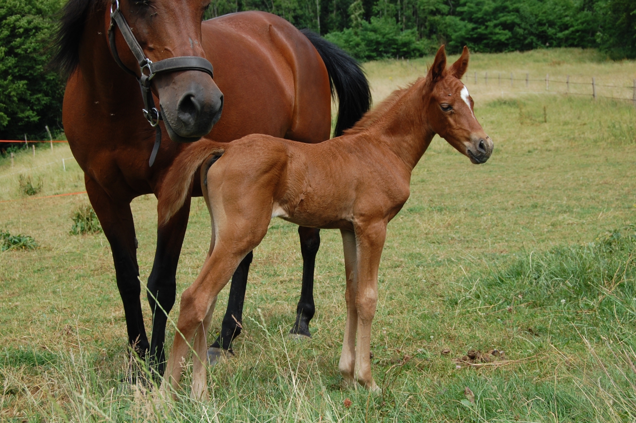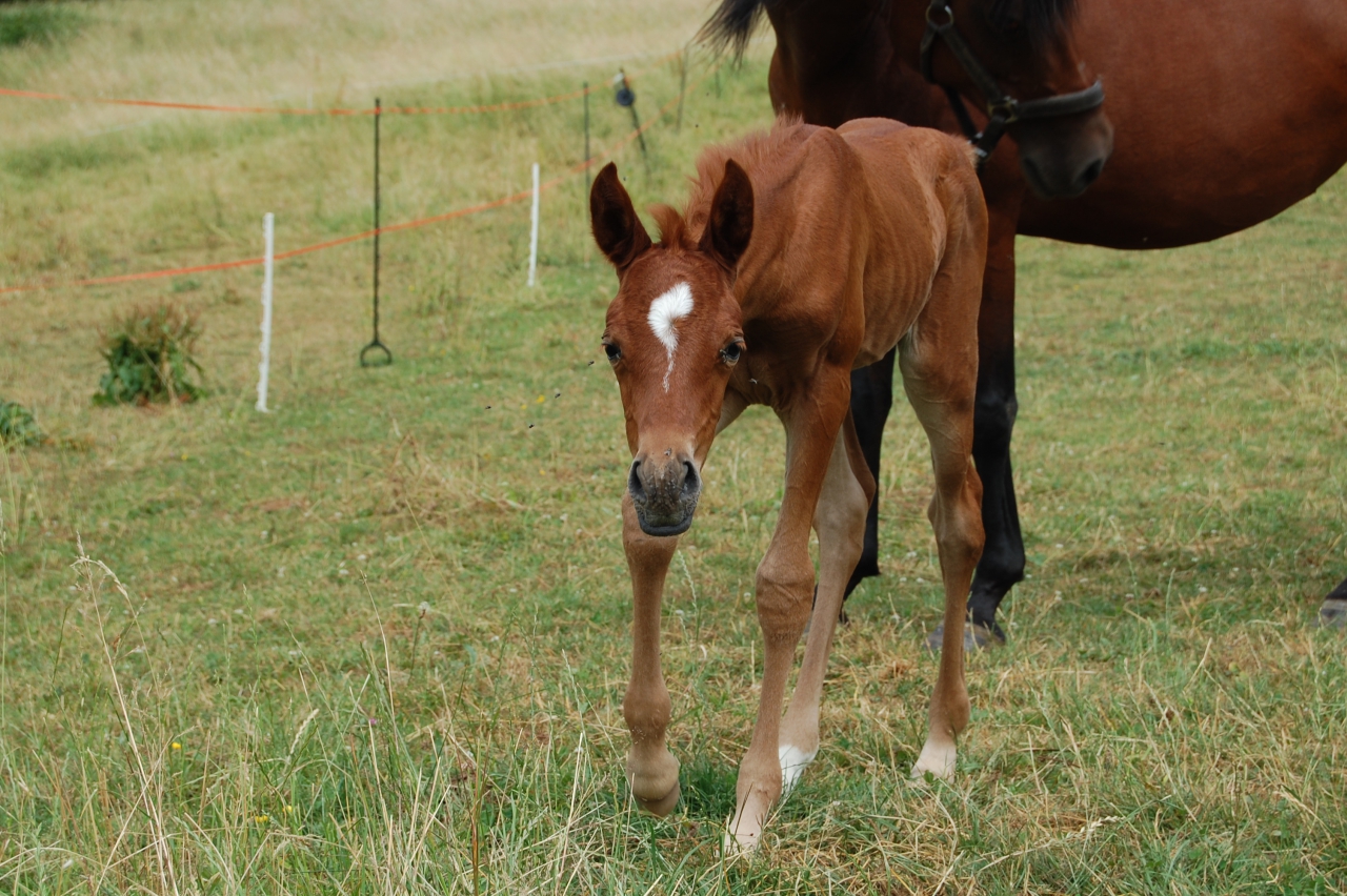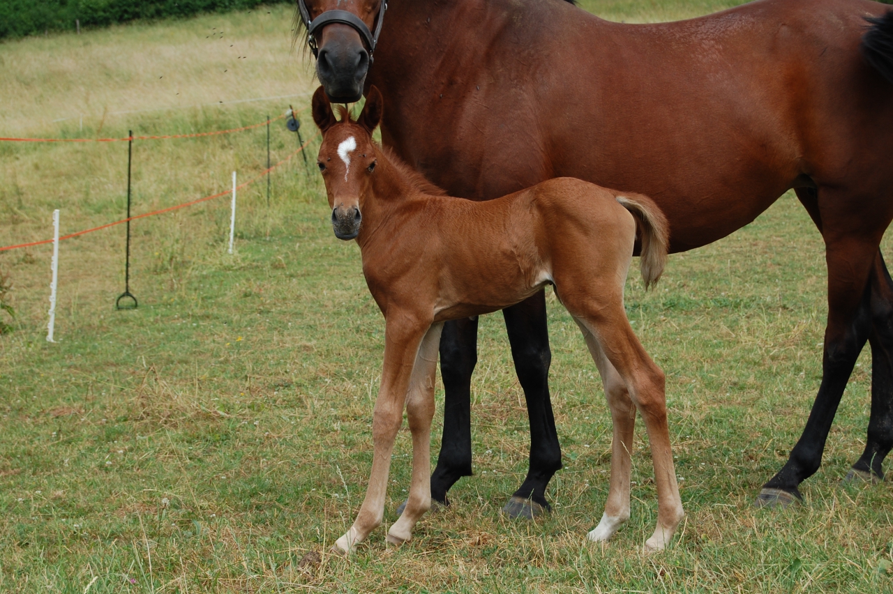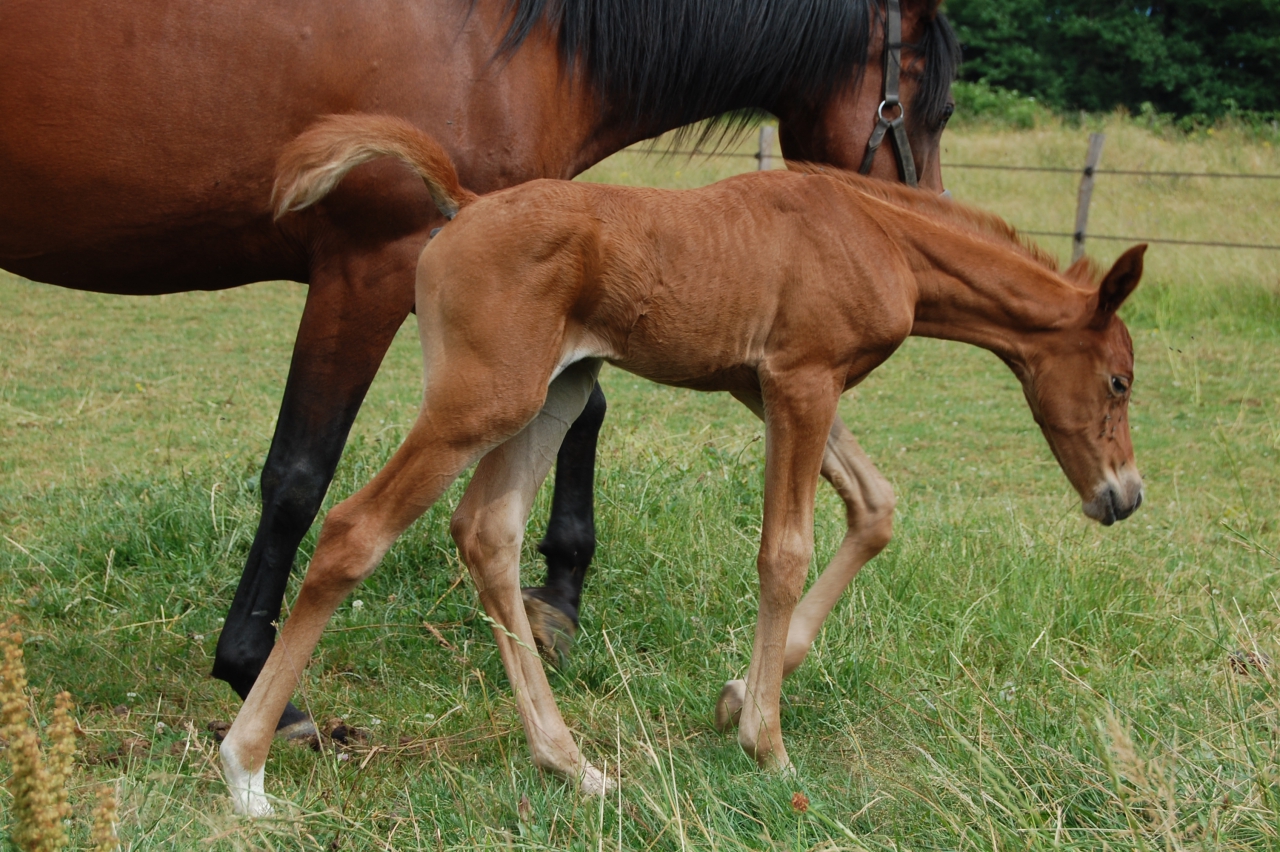 | Dire merci | De toute façon, pour sortir de l'alezan, il faut que les deux parents soient porteur du gène ![]() J'ai l'impression que elle aussi fait courir sa maman? Falkow emmène sa mère où il veut (sauf à l'heure de la bouffe, mais à un mois, il mange déjà dans les seau...) |