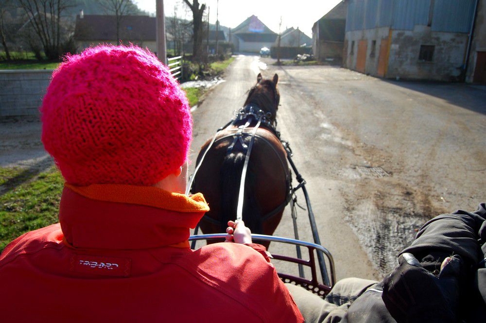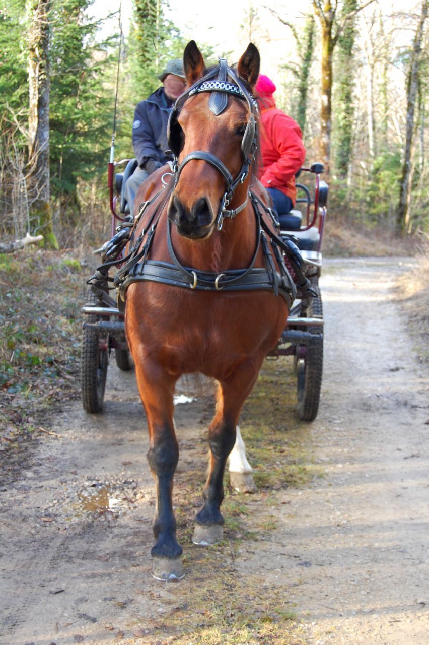on était accompagnés par une cavaliere sur son cheval, donc on est allé doucement, mais à la fin, on est repartis juste avec la caleche, on a fait un peu de galop dans un petit chemin, gé-nial ! |
