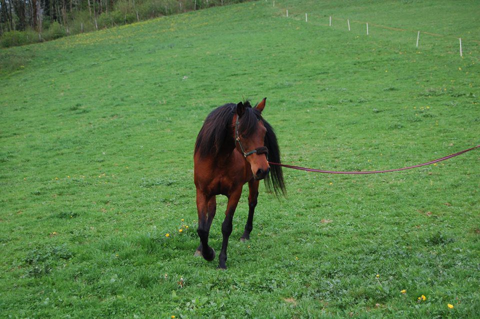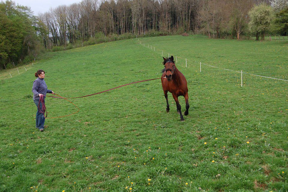 | Ce soir, séance de longe avant de reprendre le travail monté demain. Mineth était un peu dissipée : Paquita broutait l'herbe toute verte devant la maison, et nous on était dans le pré, de l'autre côté (également dans de l'herbe verte, mais où elles n'ont pas encore accès). En plus, y avait un humain intéressant qui prenait des photos... peut etre qu'il avait des carottes ?