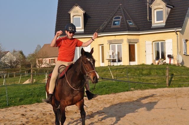 Déconnecté | Très juste al! Il m'arrive régulièrement de lui mettre un gogue. Là, j'avais peur que ça la fatigue de trop. La "pauvre bête" a été montée sur le plat juste avant par Marine, puis Jocelyn et moi même ensuite séance voltige. Et comme le sable n'était pas encore très stabilisé. J'avais peur que ça la force de trop. Mais on peut voir que sur la photo où je suis en selle en amazone, je lui fais franchir son mors et bosser son dos. et j'ai aussi souvent ça en licol (sauf quand un côté se détache ). et bien sûr quand je la monte de manière générale. J'ai du mal à accepter un cheval qui ne se tende pas |