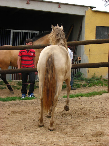 | Dire merci | Alors alors... j'ai beaucoup de photos, donc jvais essayer de vous faire un tri ![]() Comme certains le savent, je suis allée en Espagne, du côté de Barcelone, pour visiter 2 élevages de PRE. J'ai été extrèmement bien accueillie, dans les 2, mais particulièrement dans le 2e (Farriols) où l'éleveur a carrément insisté pour qu'on dorme chez lui! un homme absolument charmant et une philosophie d'élevage tout comme j'aime mais bon, reprenons dans le bon ordre ![]() YEGUADA BASSOLS pour situer les choses, élevage aux poulains à 2-3000€, saillies à 600€ pour les étalons "classiques", et 700€ pour les étalons "colorés" on commence par un poulain de 18 mois, alezan crins lavés ![]() puis un 3 ans isabelle, Torero (Ee?AaCrcrgg) ... puis Jaleo, un 18 mois... pearl! (j'ai vu son génotypage: EEAACrcrgg, donc isabelle + pearl) l'étalon le plus utilisé, Granate (vidéos très mauvaises car boiteux suite gros accident l'an dernier) et un jeune bai de 4 ans celui-là, il a des allures... même mon chéri a flashé dessus! *suite* |