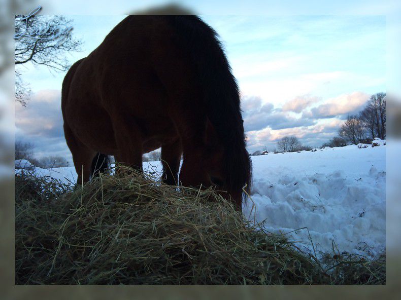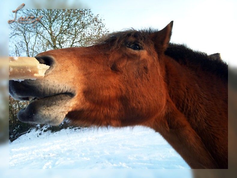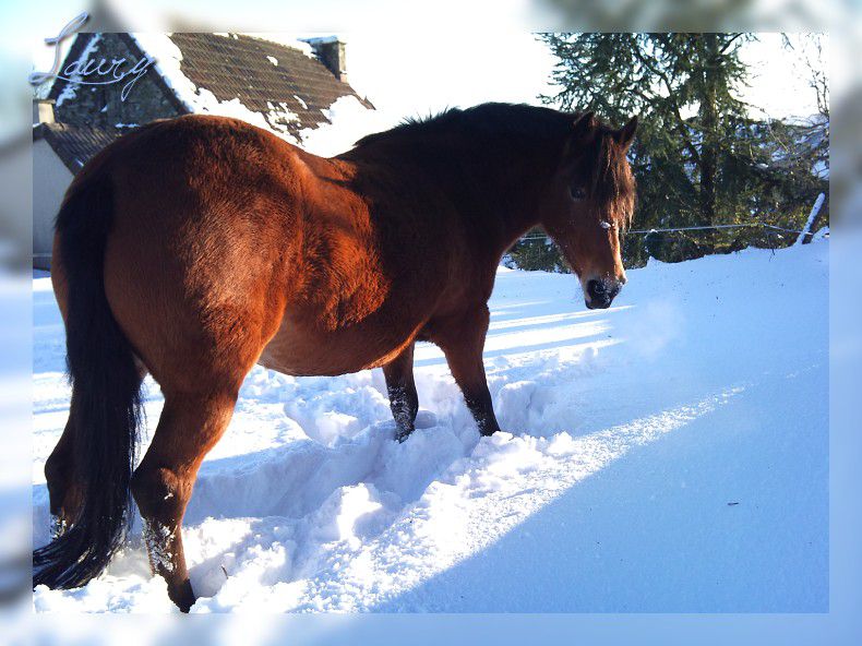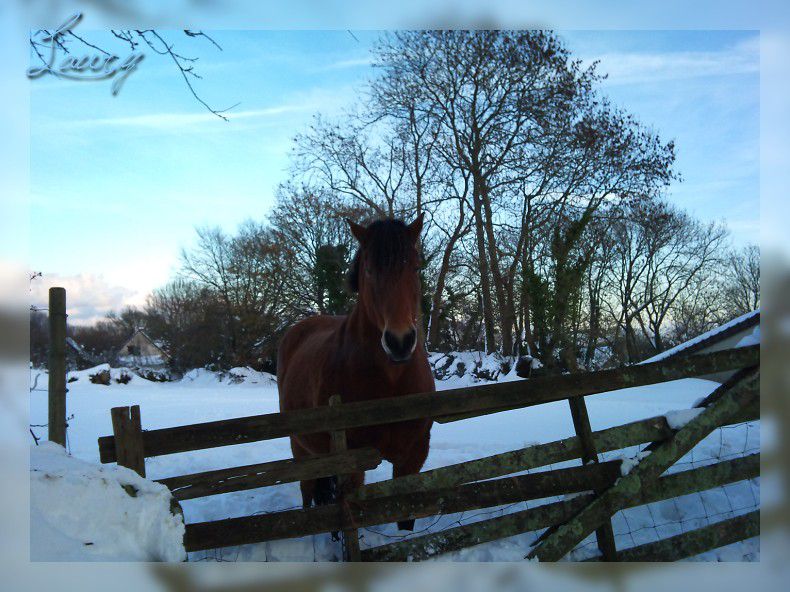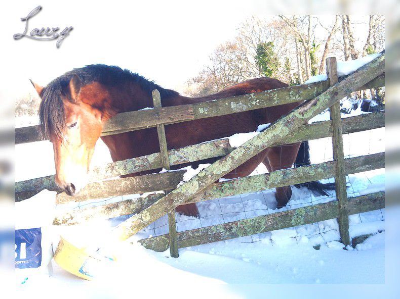 | Dire merci | Alors, je me jette sur le sac de grain, je lui met dans le seau, elle prend ça tranquillou, elle attaque pas comme une affamée. Du coup, je la laisse manger tranquille, je vais à la recherche du bac à eau, je le trouve, sous la neige, j'enlève le dessus, j'écrase la neige pour faire de la flotte. Je retourne voir Bichou, je lui donne carottes et pain sec. Et puis j'me dis merde elle a pas un seul endroit ou se mettre ou elle en a pas jusqu'au coude. Du coup, je prend le seau vide, je racle un endroit ou elle pourra marcher un peu (ça m'a tué )Ensuite une petite mémé est arrivée avec son chien, elle me dit qu'elle vient tous les jours donner son petit bout de pain à bickette, (tu m'étonne qu'elle a pas la dalle ) alors elle donnait à bouffer à mon trou du cul, et puis elle lui parlait, c'était trop mignon, la mémé elle me disait qu'elle adorait les animaux et tout et tout. Et donc, la mémé s'en va, je me remet à gratter et puis mon père est arrivé avec un gros sac de foin, et j'ai pu rentrer l'esprit "presque" tranquille en laissant louloute dans son bain de neige. Et je me dis quelque part, elle est mieux dehors par ce que pas mal de gens aux alentours on perdu leurs stabuls à cause des toits qui se sont écroulés sous la neige, trop les boules quoi... Enfin voila, frayeur du jour, à partir d'aujourd'hui, je déteste la neige. Aller, des photos pour illustrer... |