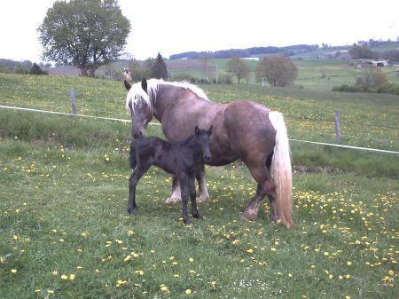 Dire merci | elle est mignonne, tu dis qu'elle n'a rien du comtois mais si quand mêmen elle est bien épaisse déjà! Elle a une belle tête on dirait! y'avait une chance/2 que le silver soit là, c'est tombé du mauvais côté, mais tu as une pouliche et en général on prèfère avoir une pouliche qu'un poulain! |