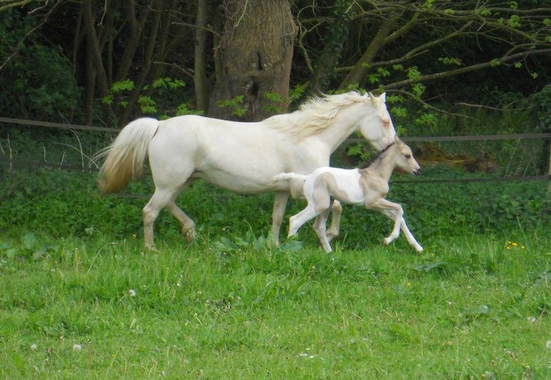 Dire merci | Alors, la maman c'est Boggies, Quarter Horse crème de lignée fondation et reining, et papa c'est Pepsi Poco Smoke, Paint Horse importé des USA juste avant la saillie: