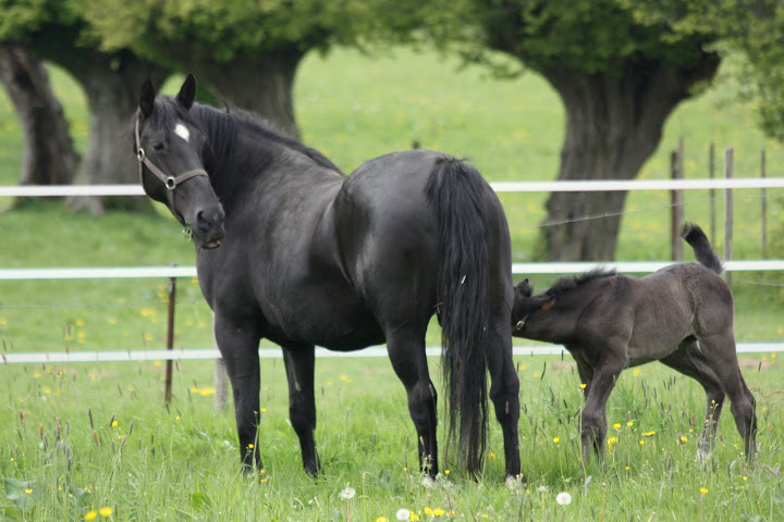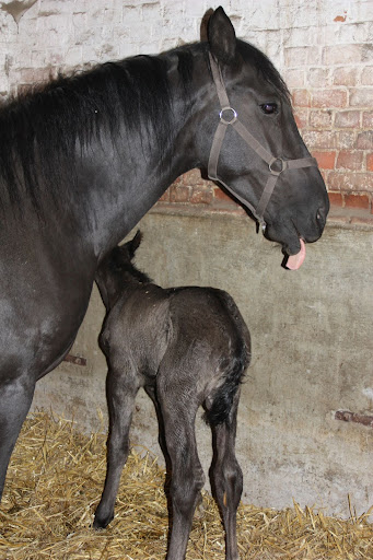 | Dire merci | Bah voilà boudin noir nous a fait son babys ce matin en cachette... la coquine... Dernière visite à 5h15 rien... depuis la veille j'y allais toutes les 1/2heure car son lait gouttait et la jument était agitée.... Après ma visite me suis endormie lourdement... réveil en sursaut à 6h15.. m'en vais aux juments sans trop de convictions et il était là debout... Sa mère complétement hystérique et qui ne cessait de tourner en rond pour protéger son poulain... d'ailleurs elle était limite dangereuse... mais bon... Tout le monde va bien.... Donc All Black est un mâle noir par Vic altaïr et Ginger (alias boudin) Sur le coup déçue... car je m'attendais tellement à avoir du pie... puis après c'est tout il est vivant et en bonne santé.... c'est le jeu ma pauvre lucette Maman est calmée... on peut enfin approcher le loulou et il est loin d'être farouche... les gratouilles sont déjà de rigueur... T'es qui toi ??? |