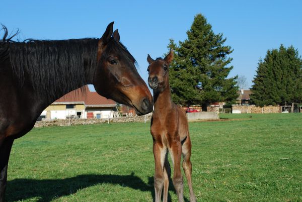 | Dire merci | la pouliche sera bai foncé comme maman au vu du noir qu'elle arbore sur les arcade et au niveau des épaules , elle est mignonne |