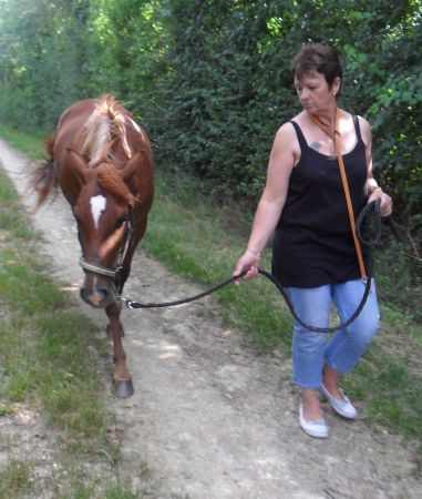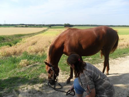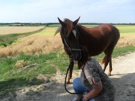| Dire merci | Bon alors, cette balade fut extra franchement !! au départ, quelques petits hénissement parce qu'on partaient sans le copain, mais au bout de 10 mètre, pouf plus rien, j'avais une jument posé, qui marchais derrière moi et zen !!! pendant la balade, j'ai voulu voir comment elle réagissait quand c'était ma mère qui la promener, en sachant que ma mère, a approcher un cheval une ou deux fois dans a vie !! et ba franchement, ça c'est passé nikel !! d'ailleurs ma mère et littéralement sous le charme de ma pepette !! Arriver au champs, je lâche la pepette, et comme son pote était parti bossé, elle c'est retrouver toute seul et faisait la con !! !! je rentre donc dans le champ pour la rassurer, je l'appelle et la voila qui arrive vers moi au galop !! j'était tellement contente !! je me met a courir et elle me suit !!! enfin bref, c'est vraiment une jument extra !!! elle est ADORABLE !! |