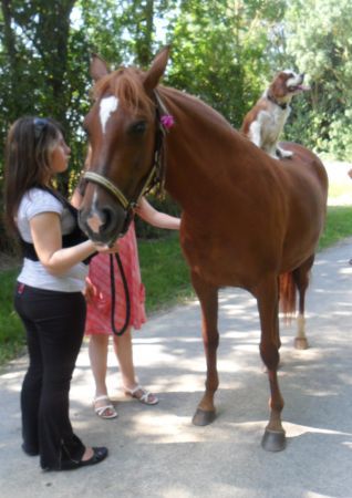 | Dire merci | mon amie va bien, elle ne souffre pas trop !!! sinon pour ma louloute, et be je rentre juste d'aller la promener !! on était en famille et c'était génial !!! elle a eu son premier cavalier sur le dos, et quel cavalier !! !! la preuve en image :![]() " alt="" /> |
