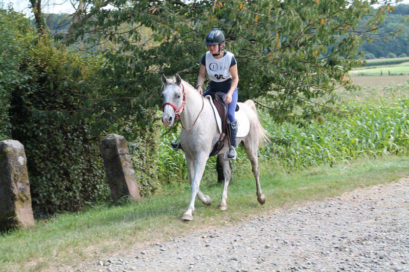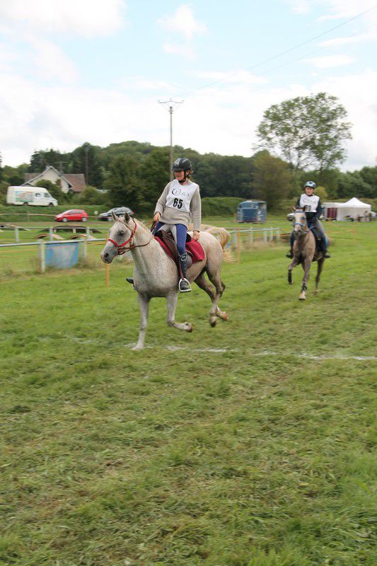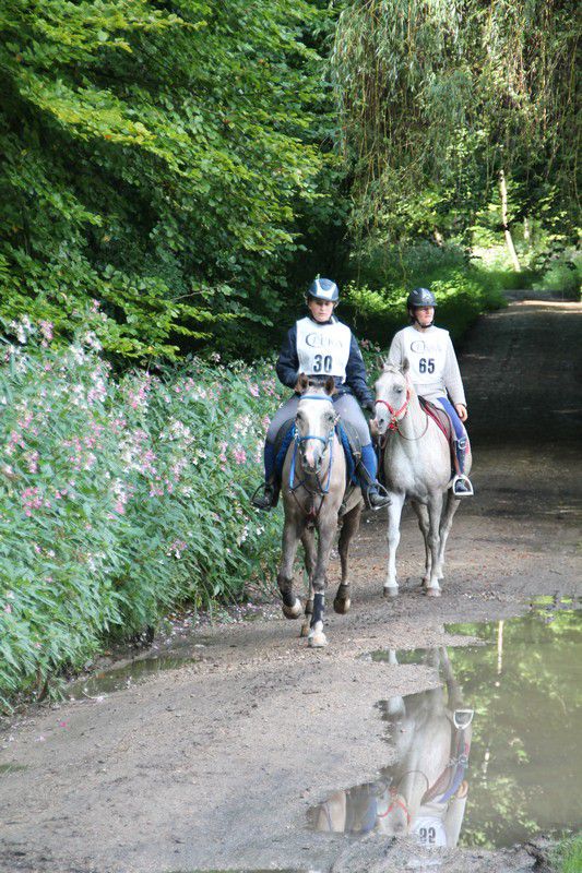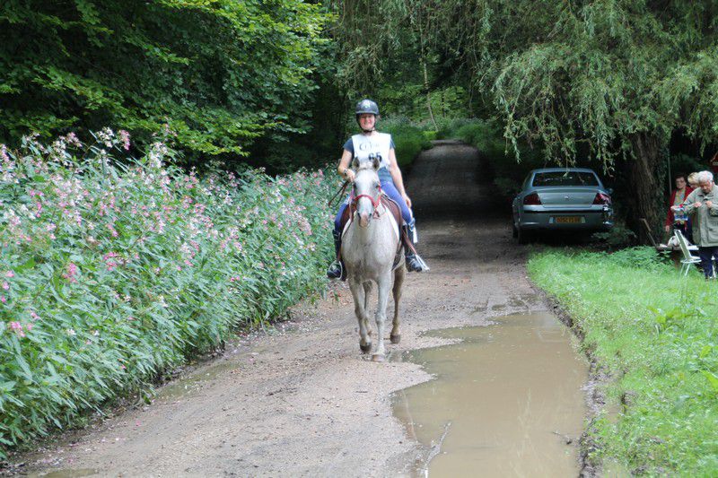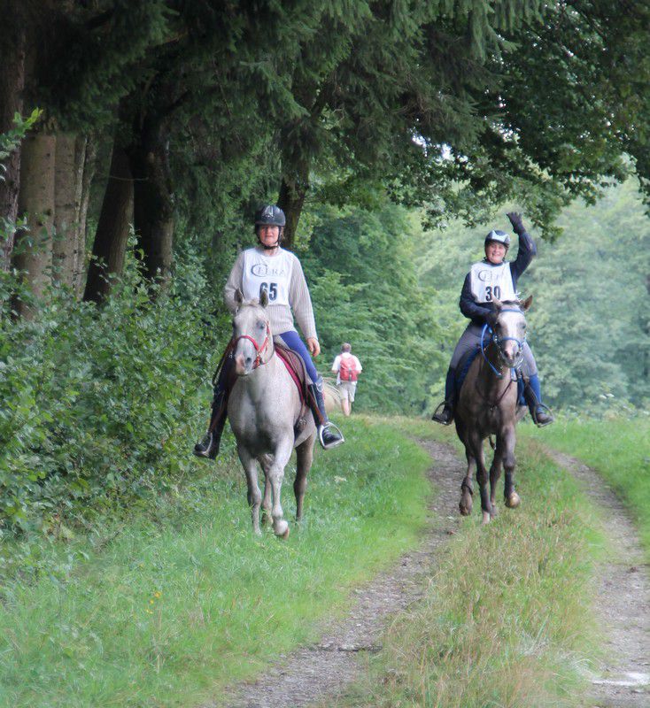 | Dire merci | Les 5 premiers km on n'a pas bcp galopé, à peine en fait après on a trouvé des endroits mais pas des masses.La première assistance est un peu loin (après 15km je crois) ensuite 20 et 26 un truc du genre. Mais bon pas grave fait pas chaud, ils n'ont pas soif, on arrose juste un minima. Nonon est seul pour nous assister toutes les deux : il assure Jusque là on est dans les temps entre pas, trot et galop on tourne quasi à 15 parfois un peu plus et puis moins....et puis à la fin le panneau 30 n'arrive pas et on a deux min de retard. On bombe pour pas trainer plus...d'où les photos de l'arrivée |