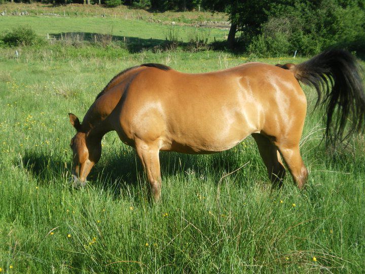 Déconnecté | le souci c'est que ce pré si Titou y va pas, elle y va pas, trop humide, ils s'y enfoncent à mi canon... Génie y met pas les pieds, on a voulu l'y enfermé ya 6 ans il a tout défoncé pour en sortir du coup il squatte l'entrée il attend que les deux autres reviennent en journée ils n'y vont pas, c'est soit le soir (comme sur les photos il était 19h) + la nuit + le petit matin à 7h30 quand je pars bosser... en journée ils sont dans la cabane a attendre que le soleil soit moins haut pour aller manger dimanche ils changent de pré, ils vont attérir dans un pré bien vert aussi haut avec une fauche d'ortie en bas du pré, pré tout en pente. je vais surement les laisser deux semaines la bas le temps de les vermifuger, puis revenir dans ce pré. et début juillet si possible ou fin juin je sais pas on va les changer encore de pré direction le pré d'hiver qui n'a pas été mangé depuis fin Mars, autant dire qu'il est gras car on avait mis de l'engrais. bref ils vont avoir de quoi manger, ya que pour Aout septembre que ca va etre dur Ocre part à la saillie début juillet logiquement donc j'aurais pas de souci à me faire pour elle (quoi que faut que je dis à l'étalonnière qu'elle fugue si les clotures sont merdiques et si ya rien à becter |