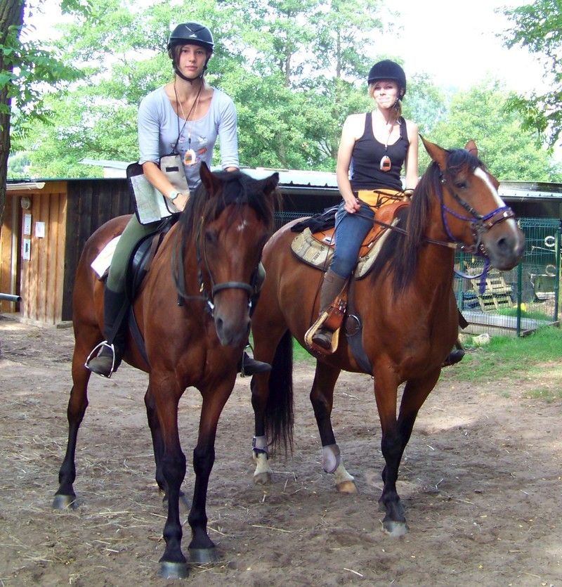 Déconnecté | Je pense que je vais pas trop m'embêter pour le tapis (j'avais vu le reinsmann), je vais en prendre un classique, assez rembourré, j'en ai marre de chercher celui qui va aller de plus en ce moment j'ai pas de sous pour en racheter un aussi cher que le Haf ![]() En fait sur ma selle j'ai réglé les étriers très longs (j'ai un problème à un genoux s'il reste plié trop longtemps, une fois que je descend je peux plus marcher ), j'y suis très à l'aise pour le pas et le galop (en fait pour rester assise).Mais pour le trot enlevé (je sais qu'en western c'est pas le but mais ma selle n'est pas vraiment une western ) je galère un peu.Sinon ma juju' est très confortable au trot.Et oui j'ai aussi le pb de l'installation, surtout que mon terrain est en pente (je vis dans des côteaux), donc pour faire un carrière il faudrait niveler le terrain (mon père a une mini pelle donc ça va) mais en ce moment il a pas trop le temps. Donc je me contente d'un rond de longe pas pour la longe justement pas droit du tout pour faire bosser mon poney qq fois en liberté.Et c'est vrai que c'est dommage de pas avoir de petite carrière car j'aimerai apprendre des choses à ma juju' (genre les incurvations elle connaît pas) de plus, mon nouvel arrivé ( Oregon) connaît très bien le dressage de basse école donc j'aimerai un peu exploiter ce potentiel ![]() Pour l'endu je suis persuadé qu'elle y arriverait, elle sort souvent, est habituée au rando toute la journée ou sur plusieurs jours. ils ont pris des vacances séparés donc elle est chez mon chéri ac sa jument -->si je comprends bien ton chéri aussi fait du cheval alors ![]() |