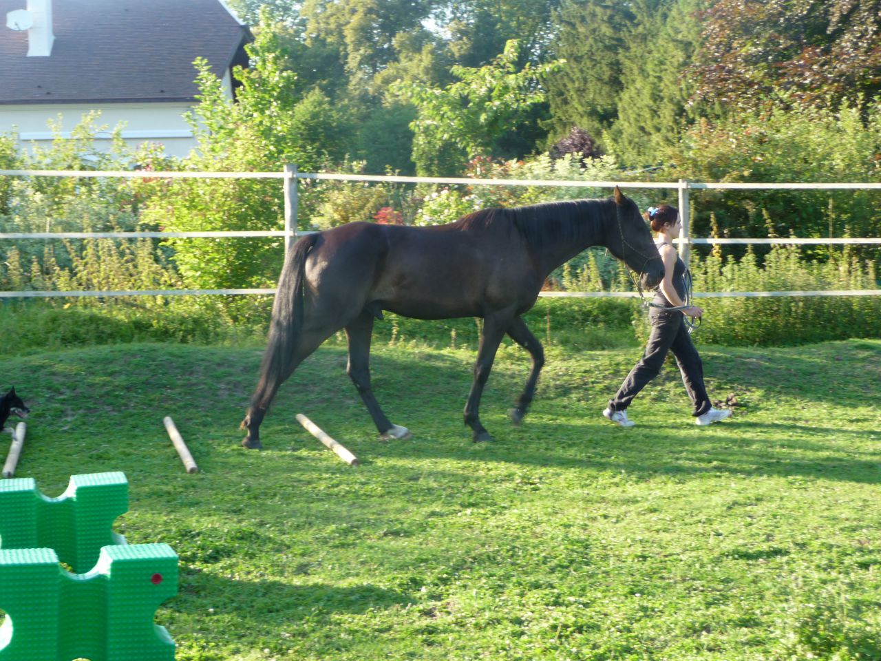 | Dire merci | Dimanche 28 aout j'ai fait ma 1ère séance d'obstacles montée avec Urus !!!!!! D'abord on détend dans le rond de longe en liberté = beaucoup mieux qu'avant car il me regarde et il se met plus facilement au galop qu'avant. Ensuite direction la carrière, enfin le pré d'à coté ! je monte, on détend au trot et galop, il galope à 4 temps pour l'instant, il va falloir que je décortique son galop! lol ensuite je passe une barre au sol au pas, au trot à chaque main. puis croisillon ou là je demande un peu plus d'impulsion car pépère urus se foulait pas de trop !! Comme il touchait un peu les barres on a mis une barres d'appel et là magique urus a beaucoup mieux sauté !! on a finit avec un droit et voilà!! Je suis très fière de lui et de moi par la même occasion car l'obstacle et moi çà fait 2 alors lui faire sa 1ère séance çà m'a vraiment fait plaisir !!! Désolé pas de photos car j'étais trop prise dans l'élan pour demander à mes spectateurs de prendre quelques photos ! lol |
