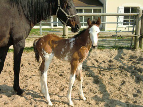 DéconnectéDire merci | Le male est réellement pie bai ou bai sabino maximum ? D'une maniere générique et selon la nomenclature officiel des Haras Nationaux il est pie-bai. Seulement il existe plusieurs génes donnant une robe pie. Un de ces géne est le sabino et ce poulain est effectivement sabino ( mais pas maximum sabino, car "maximum" cela donne un cheval quasi blanc). |