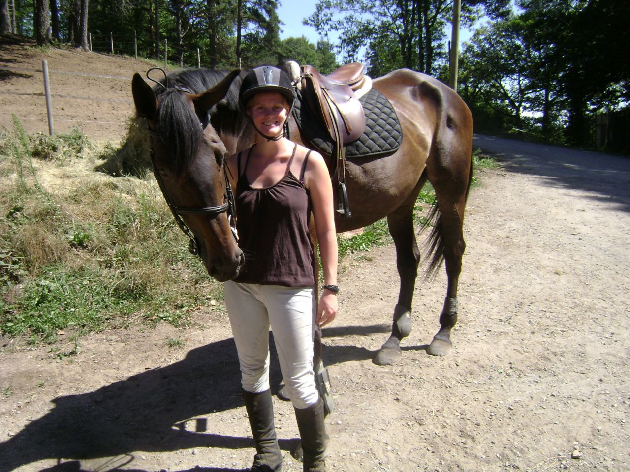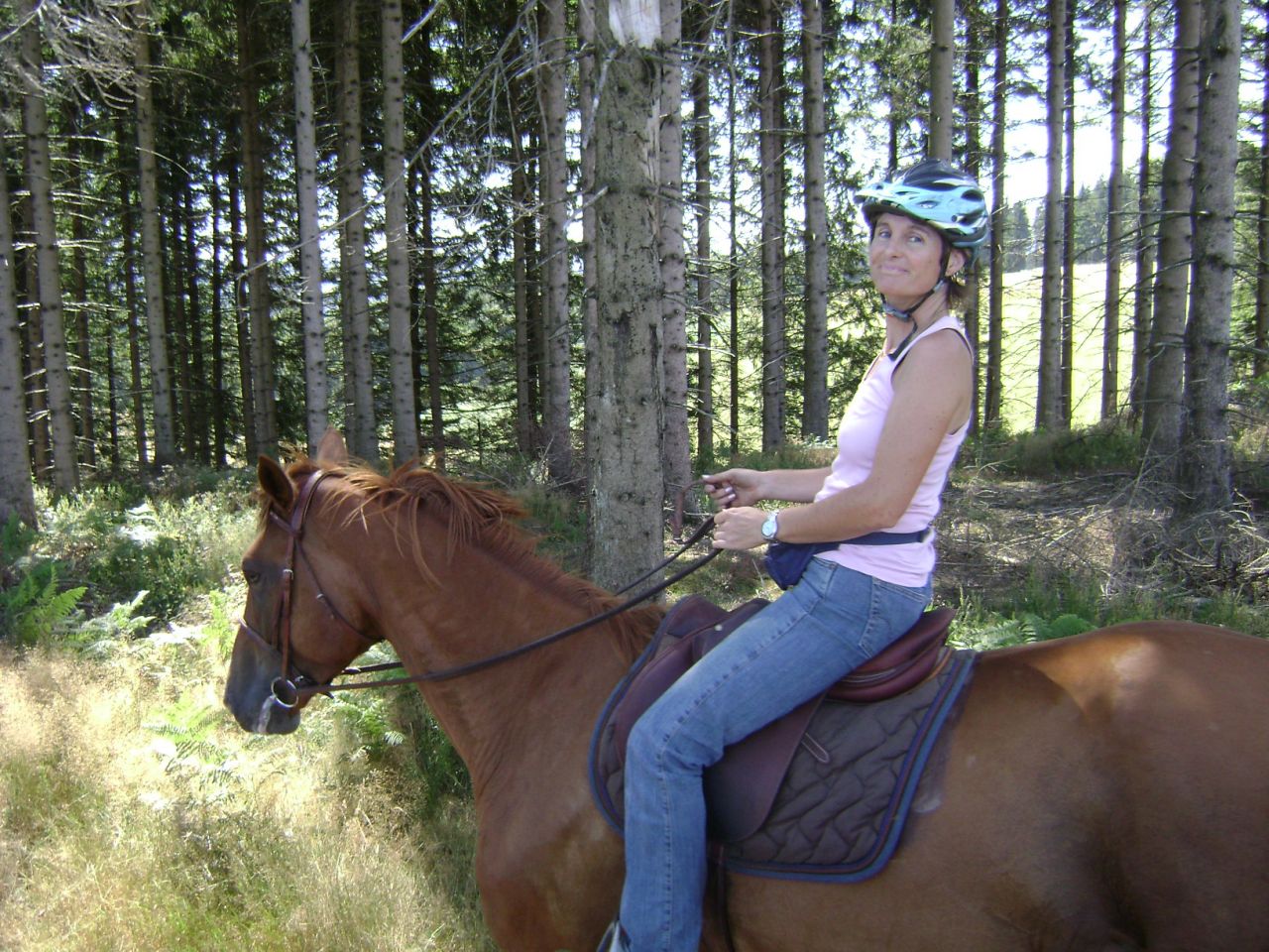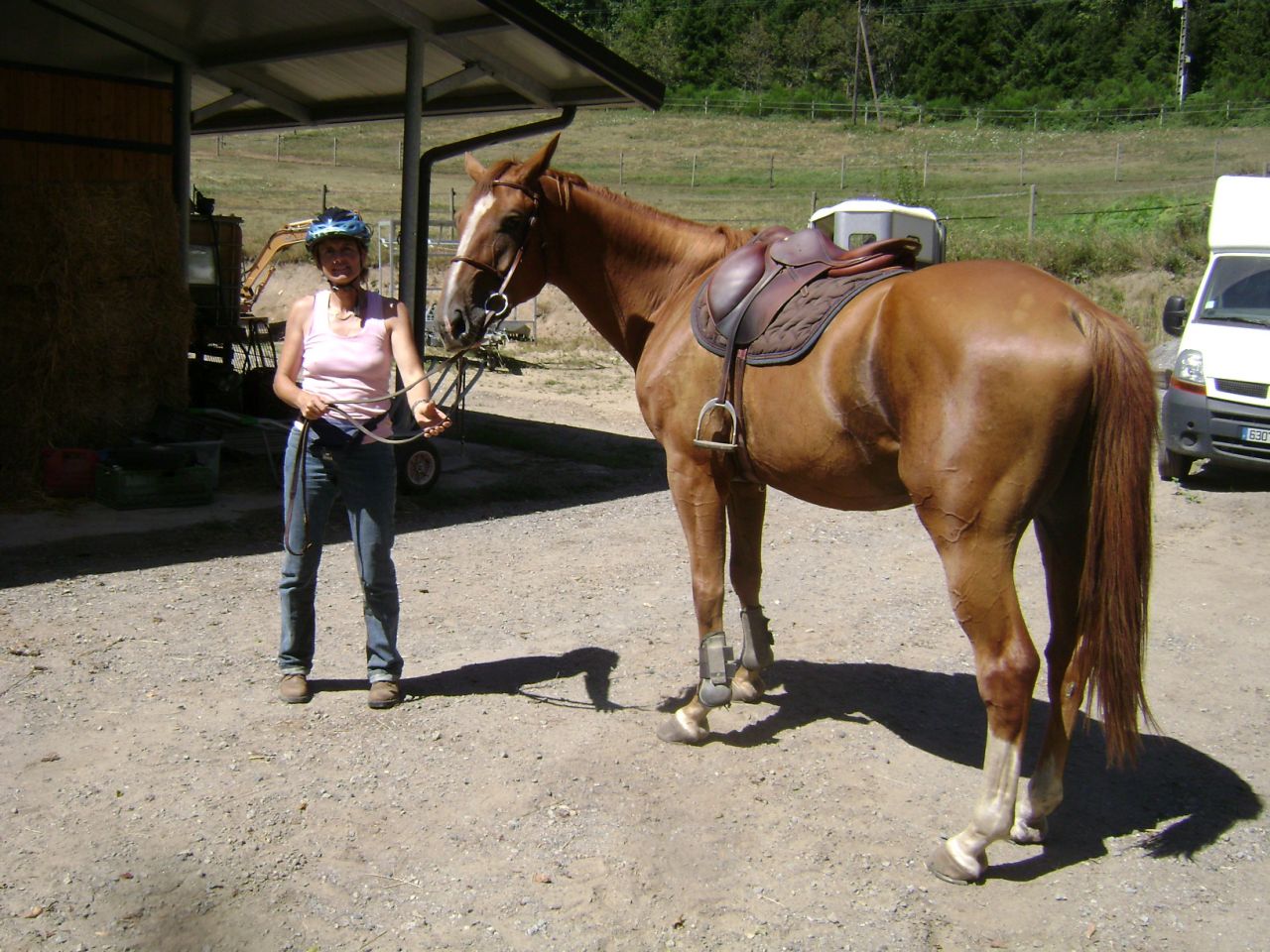 | Dire merci | Il faisait très beau et chaud et Titounette a proposé de nous prêter des montures afin de faire une promenade dans les forêts environnantes. Nos montures : des selle français d'1,75 m pour moi et d'1,80 m pour Florette du forum !!! Peu habituées (plus du tout en fait) de monter de si hautes montures, on a tiré à la courte paille en roulant des yeux effarouchés par derrière Titounette pour ne pas montrer notre émoi... Ma monture : Sisco, 4 ans, de la famille de Dollar du Murier (fils je crois mais pas sûre, Titounette rectifiera) ![]() |
