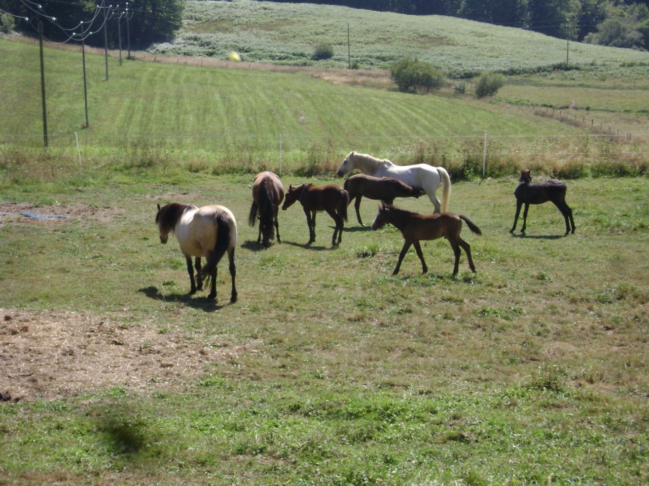 | Dire merci | Il y avait dans ce pré, 4 poulinières avec leurs rejetons mâles...ces chevaux ont des origines prestigieuses dans la race, avec des origines +++ et des papas, tontons qui sont hyper classés en saut d'obstacle (+ de 160 points...je ne sais pas ce que cela signifie mais d'après ce que m'a expliqué Titounette, c'est le summum en poney de sport...)![]() |