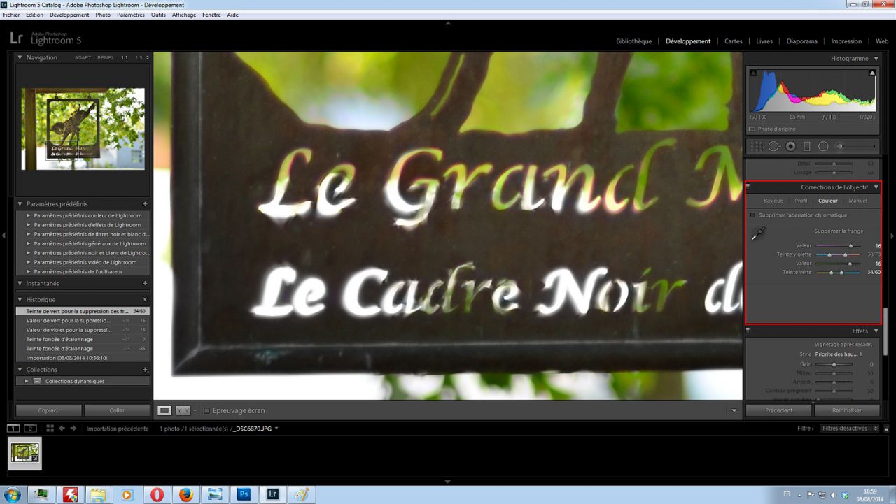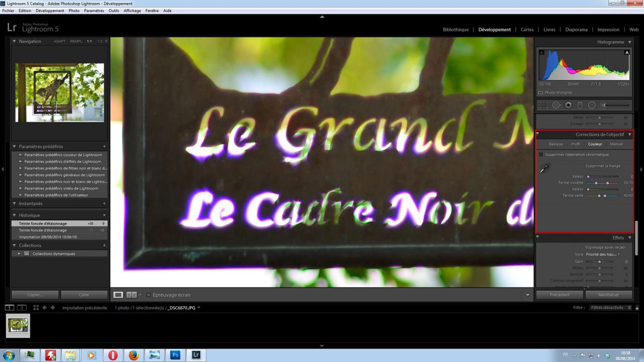 | Dire merci | tu as essayé d'utilisé les filtres "dont je sais plus le nom" (en bande la) pour le ciel ? ça fonctionne bien aussi j trouv Non, je ne vois pas Pour le choix, c'est peu être parce que le ciel ressort beaucoup moins sur celle en NB, elles ne sont pas traitées pareil. Bw, l'option "supprimer les aberrations chromatiques", je l'utilise kazi sur toutes mes photos, ça devient systématique même quand elles ne sautent pas aux yeux. La clairement, c'est inefficace pour faire disparaitre le violet. J'ai augmenté la valeur du violet comme sur ton exemple, le résultat est nettement mieux, merci pour tes conseils. Mais y'a-t-il un risque de poussé la valeur à fond ? Elles sont assez grosse ça c'est sur, elles m'ont sautées aux yeux et c'est bien à 2.8 . |