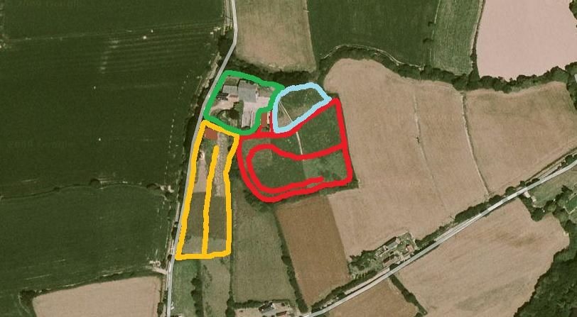 | Dire merci | La maison est dans la pointe en haut du triangle, l'écurie, c'est la grange juste en dessous et on a divisé le parc en 4, avec un chemin entre la partie "élevage" et la partie "chevaux montés" qui suit le zigzag des arbres au milieu. Chaque partie est divisée en 2, un pré hiver et un pré été. Les abris avec foin sont dans les ronds bleus. On verra si c'est bien à l'usage, ça fait environ 5 hectares, pour l'instant c'est très pratique (mais je n'ai pas encore vécu d'hiver ici )![]() |
