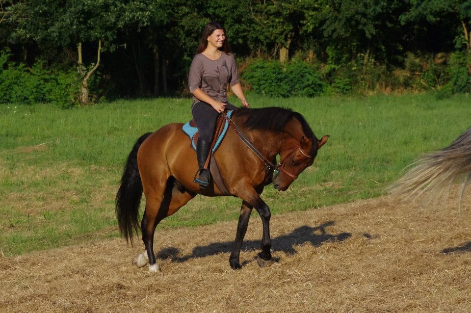 | Dire merci | moi ce que j'entendais plus par le laisser aller vers l'avant, c'est le laisser descendre bas (attention, sans qu'il ne précipite, donc à toi de te tenir droite) en gros, je pense qu'il faut dans un premier temps, qu'il soit stable et fluide en "bas et rond" (pas forcément le nez par terre hein) et ensuite, mais SEULEMENT ensuite, tu le remonte doucement en le mettant de plus en plus sur "le cul" . En fait, (sauf erreur de ma part) je ne crois pas qu'elle me demande de l'assoir tout simplement parce qu'elle doit se douter que ca n'est pas dans mes compétences actuelles^^ Pour cette raison qu'elle n'utilise peut etre pas les bon termes et qu'elle me demande vulgairement de le ralentir EN me redressant parce que au final je vais arriver à faire ce qu'elle me demande sans vraiment m'en rendre compte. Je l'entends souvent dire qu'elle veut le redresser et je pense qu'elle travaille dans ce sens quand elle le monte. Après elle est obligée de faire en fonction de mon niveau, même si ca n'est pas les meilleurs conditions pour le cheval ![]() En tout cas merci d'avoir pris le temps d'analyser et d'expliquer ton ressenti, je lui ferai lire au plus vite, ca ne peut qu'apporter du plus! Dernière chose pour le pianoter des doigts: elle me dit souvent que je tends bcp trop ma renne intérieur et que ma renne extérieur est trop souvent flottante. J'ai du mal à dissocier mes mains, mais je vais effectivement essayer d’arrêter de pianoter avec les 2: garder ma renne extérieur bien tendu et la renne intérieur plus flottante avec laquelle je pianoterai. |