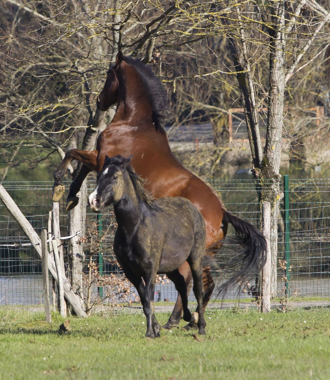 | Dire merci | Bonjour bonjour! Commençons ce topic-fleuve par une petite présentation des protagonistes ![]() Akanto, dit « poulichon », jeune étalon PRE noir né le 19 mars 2010 d’Ebanisto 6 et Nocturna XIII, à l’élevage Rozière. Un "pti jeune" aux multiples adjectifs, dont on retiendra particulièrement celui-ci : «calme ». Posé, réfléchi, c’est un élève modèle, quoique très gourmand. A côté de nos sorties "loisir" (il est labellisé Elite Loisir junior et monté, et on commence le TREC), Akanto commence le dressage de façon un peu plus sérieuse avec un cavalier, et commence à avoir des résultats très encourageants On fera d'ailleurs la finale européenne des MCI en novembre prochain en Belgique! Mais le gros de son emploi du temps, c'est de vivre au pré avec ses juments, une vraie vie de famille... ![]() Ma première jument, c'est Lebrera XXXVI, jument PRE PP née en 1999. Je la connaissais avant Akanto, j'ai failli réserver son poulain 2010, mais les aléas de la vie on fait que.... et puis la chance aidant, j'ai pu la racheter en 2012 car je rêvais d'un poulain d'elle, qui plus-est avec Akanto! Elle est la mère d'Eléio et de Falcon d'Auréa (né le 7 juillet 2015). ![]() Et le petit Falcon, surnommé Bambi ![]() ![]() Vient ensuite Eléa, jument de race Schwarzwalder née en 2007, une race de demi traits allemande (Forêt Noire). Eléa m'a été confiée par sa propriétaire pour une durée indéfinie, c'est une splendide jument, championne de M&A dans sa race et mère de champions également elle est très douce et caline Elle est la mère d'Elégie d'Auréa, née le 13 mai 2014, et de Faline d'Auréa, née le 3 juillet 2015. ![]() La petite Faline, à l'image de sa robe....elle a le feu! ![]() Enfin, Nikita (PRE baie, demi soeur de Lebrera par le père) et sa fille Féérie nous ont rejoint au cours de l'été, pour un poulain avec Akanto en juin 2016 ![]() Sans oublier Vicky, qui nous a quitté brutalement le 12 avril 2015.... Mon premier cheval, que j'ai rencontré 18 ans auparavant, dont j'ai rêvé d'être la propriétaire pendant 8 ans, et ce rêve s'est réalisé, durant les 8 dernières années, il m'a suivi à Lyon, en Alsace, et à Toulouse, où il a fini ses jours, entourés de sa "famille", toujours beau, toujours fier, un cheval exceptionnel, un sacré carafon mais incroyablement gentil et tolérant.... mon « vieux beau » qui me manque.... Lien ![]() Voici donc les chevaux qui composent mon jeune élevage, l'élevage d'Auréa.... à suivre au fil des pages... Lien Message édité le 23/12/15 à 11:57 Message édité le 01/01/16 à 22:03 |